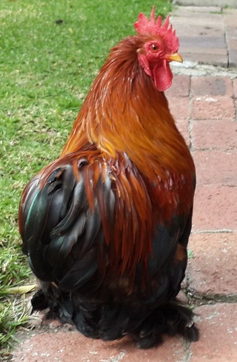 my cockerel showing me how straight he can stand up he had a perfect comb until a tussle with my dominant black hen.