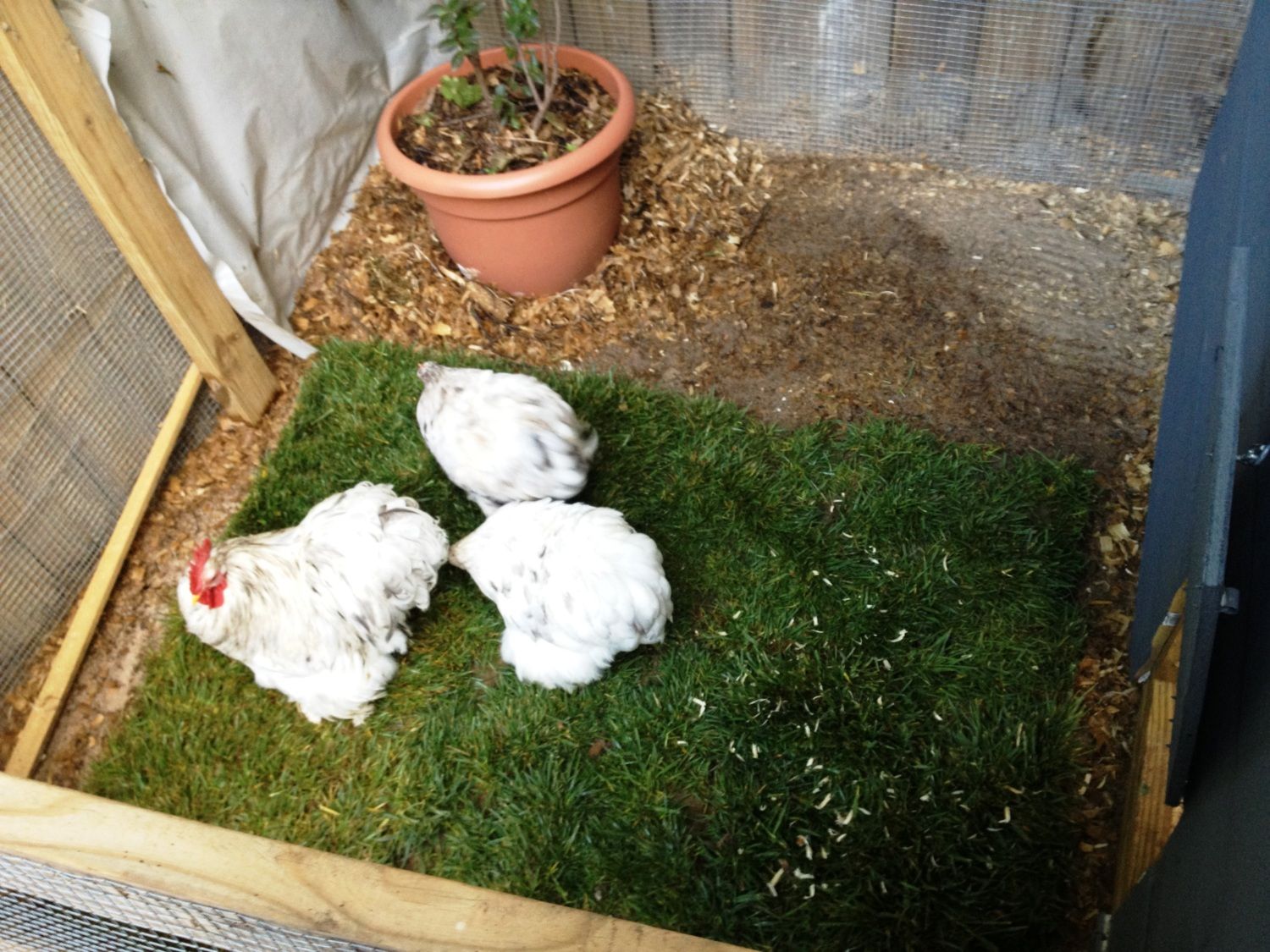 This is my trio of splash bantam cochins in their little pen...I finally got some fertile eggs then they went broody...they love their little bit of outside lawn...
