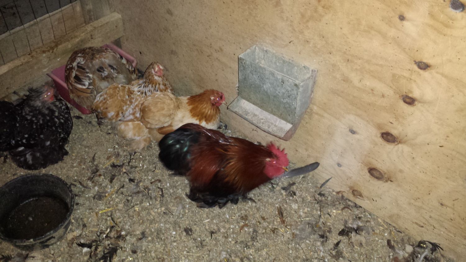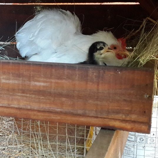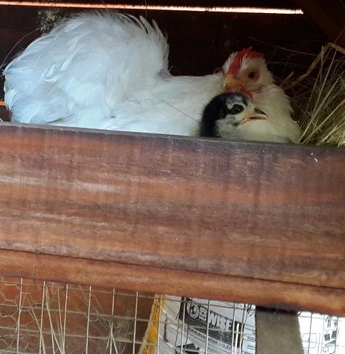 What i found odd was that she hatched this chick two weeks ago and already is laying, here she is, with her little mottled keeping her company.