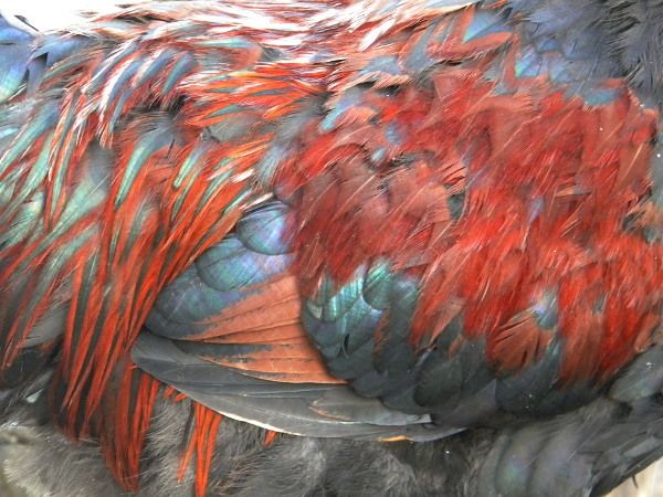 I had a few questions about Partridge Cochins, and was hoping that some of you who really knew Cochins could share some insight. We have a sweet, fluffy and mellow,19 week old standard sized Partridge Cochin cockerel with very fluffy feet (but they are full of mud here. lol) who seems to be turning into a handsome fellow. His coloring is a soft black (vs.being dark black), with a scarlet head, iridescent purple/ teal and blue laced feathers around the chest, wings. Burgundy and blue across wings and blue and red saddle laced feathers. His tail seems nice and full. He runs like I think a T-Rex would run. lol
