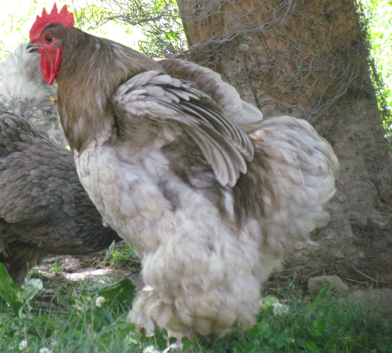 I'm guessing him to be a Splash with tawny leakage. I don't know what you're feeding, but you might look into a non-corn based feed just to see if that has an effect on the color. FYI the tawny color is not a desirable trait so you would want to see if it could be dietary or that is his true color. He looks to be a clear blue as a chick, so............