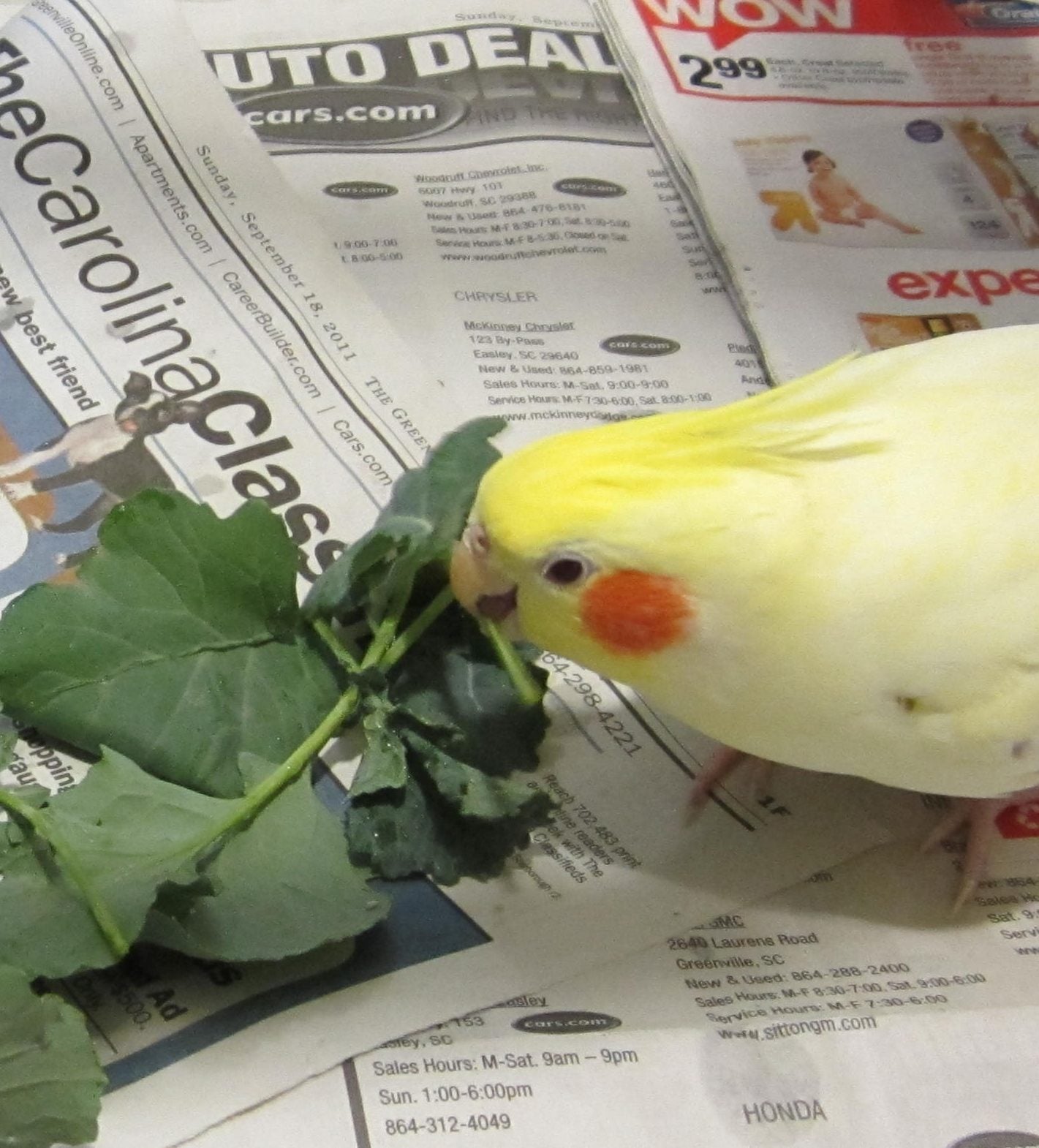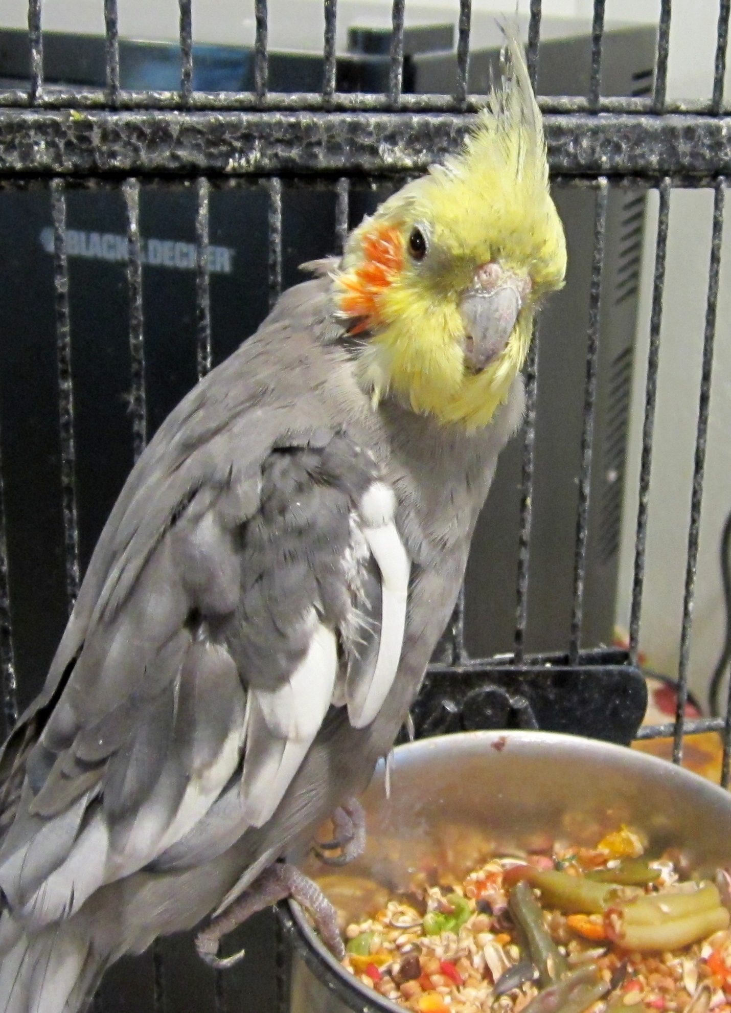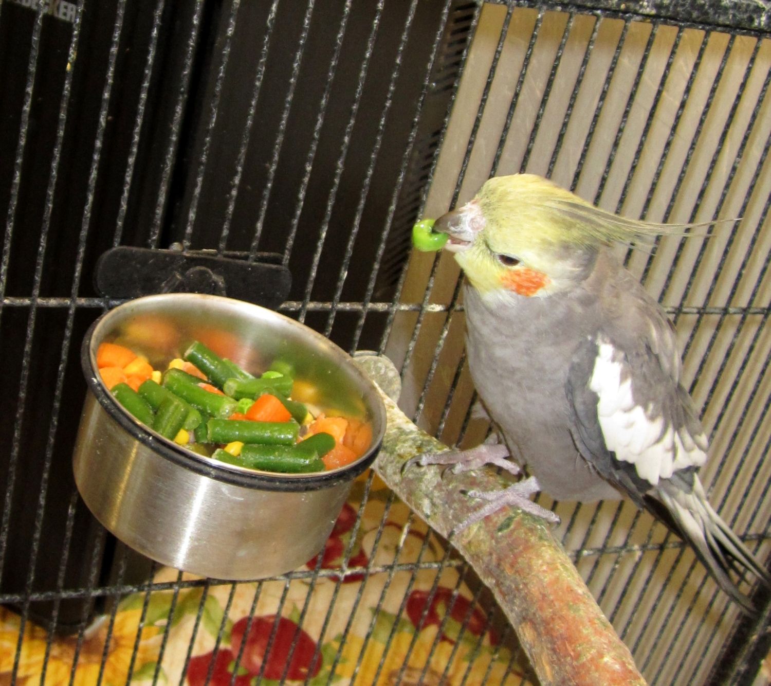 Under the layer of veggies (frozen mixed) is the daily portion of cockatiel seed. At first, many birds will simply push aside the veggies but as time passes, the curious cockatiel will put a sample in his beak, and eventually will start eating them. I really like cockatiels. The feathers are dusty, but cockatiels make good apartment pets as they can't make as much noise as some birds.