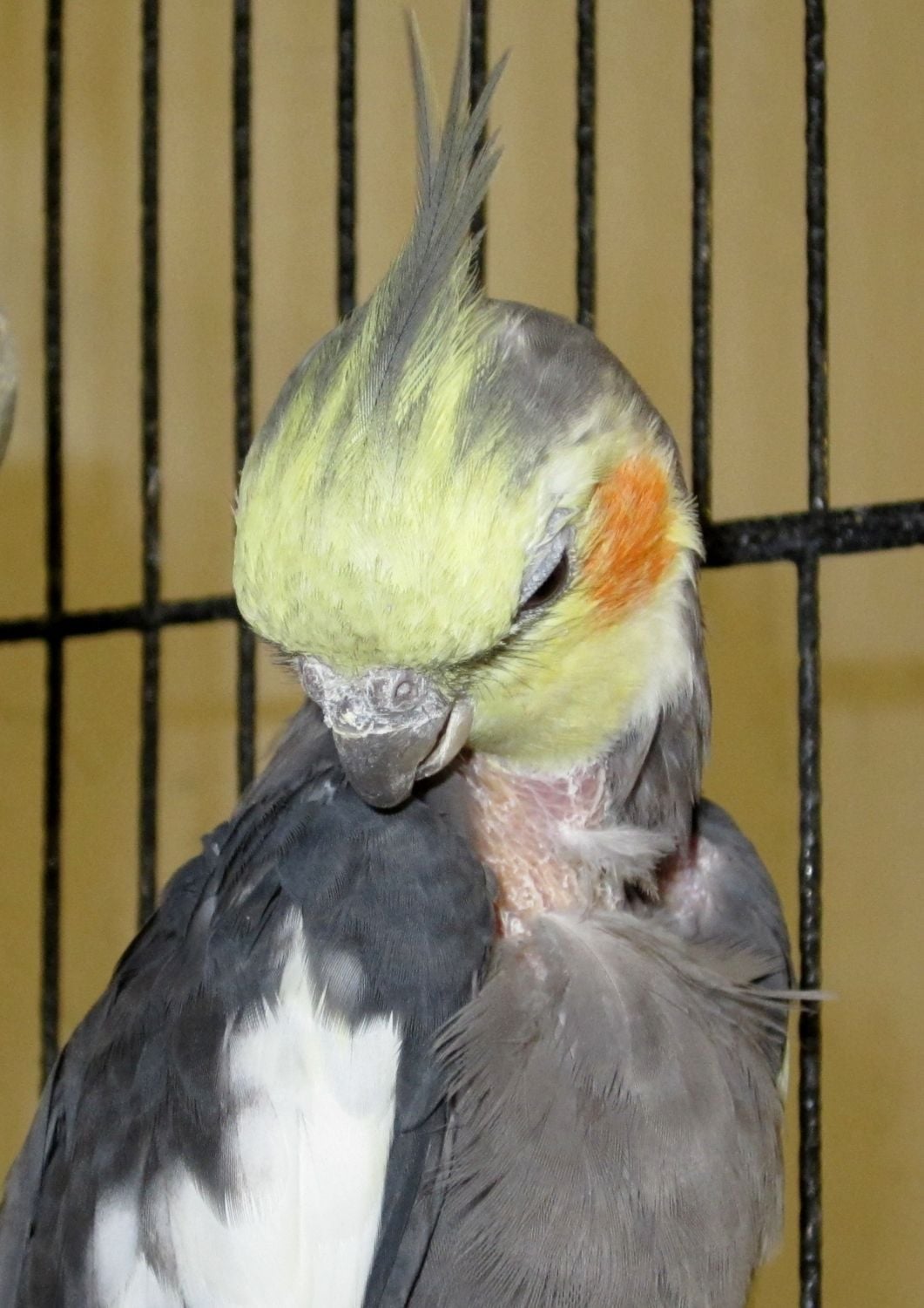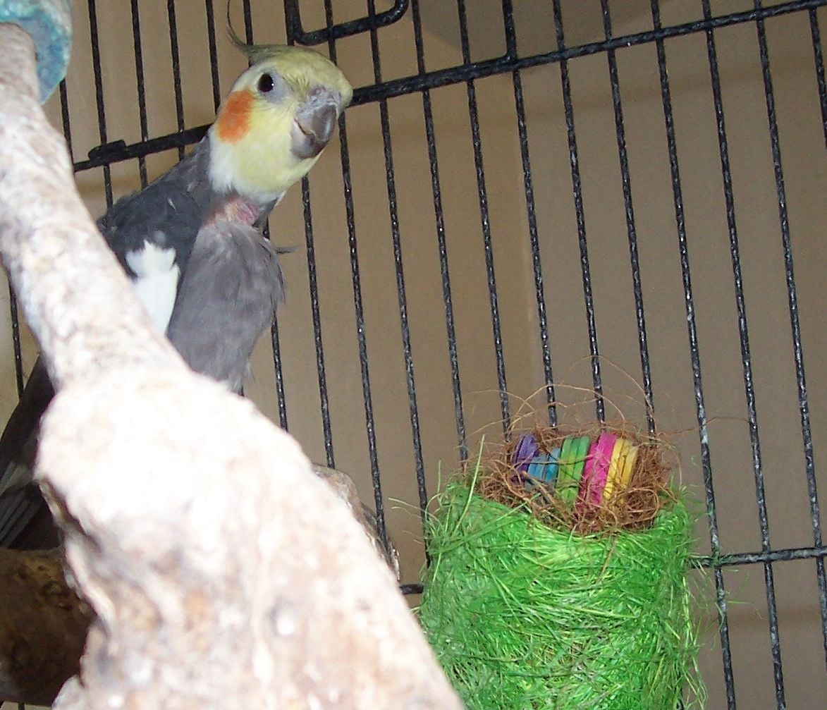 Under the layer of veggies (frozen mixed) is the daily portion of cockatiel seed. At first, many birds will simply push aside the veggies but as time passes, the curious cockatiel will put a sample in his beak, and eventually will start eating them. I really like cockatiels. The feathers are dusty, but cockatiels make good apartment pets as they can't make as much noise as some birds.Old chick I was interested to see your tub of veges. Ours is a bit picky but served like that looks much more inviting than when we push something in the wire. Going to try serving it up like that in the morning!