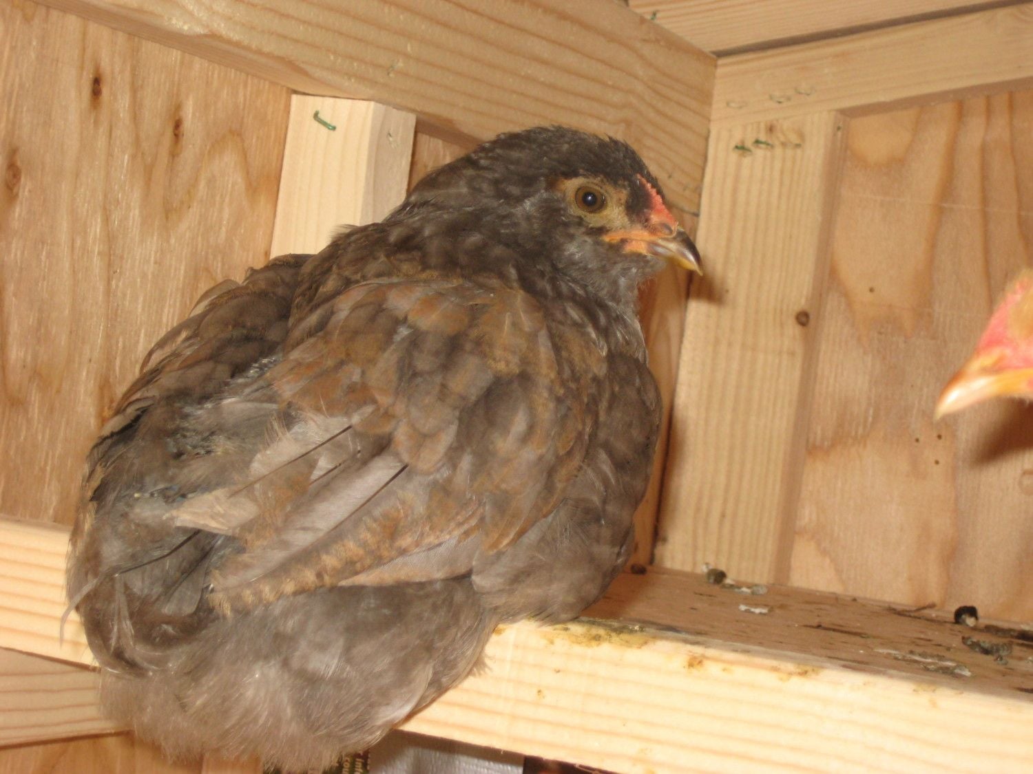 I just had to put this guy in a bachelor pen with two of his hatchmates, all 6 week old Serama cockerels. He has been antagonizing the little pullet he was in a cage with, and then when I put another baby in the same cage, he latched onto the side of her neck and I had to intervene. Yeah... he's been *strangled parrot* crowing for a week or more now, and he is indeed showing very very male behavior. Gah. Little perv.