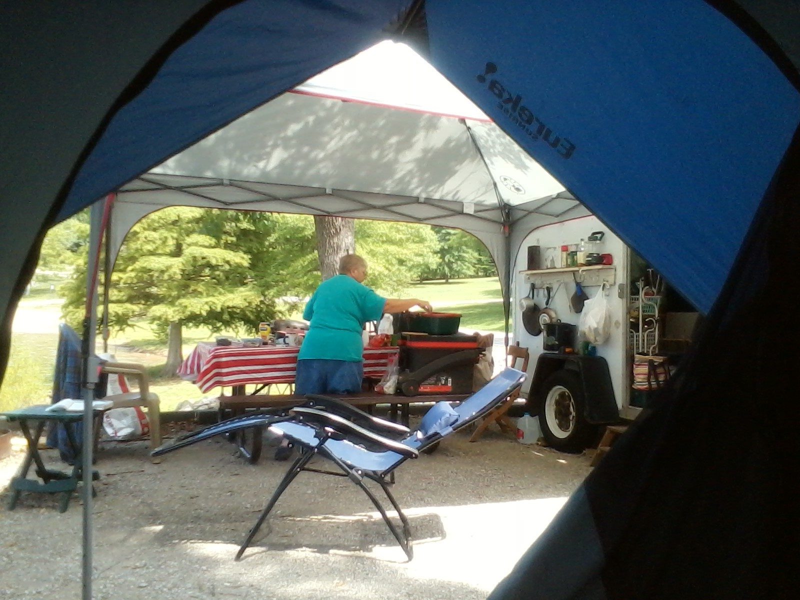 DW at kitchen table Taken from tent that is my utility trailer with all my gear in it.