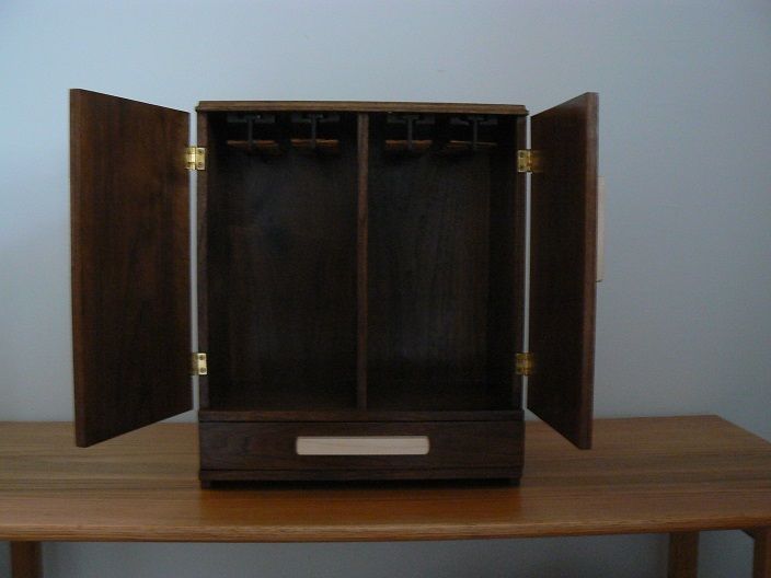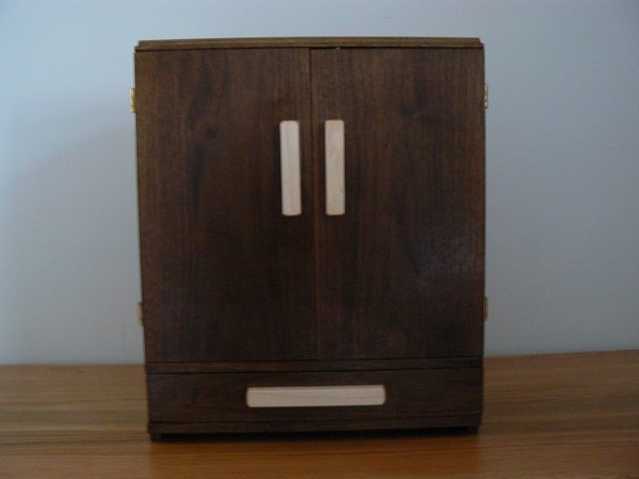 Black walnut, stained with a dark chestnut stain, maple pulls stained with clear stain, finished with shellac and wax.