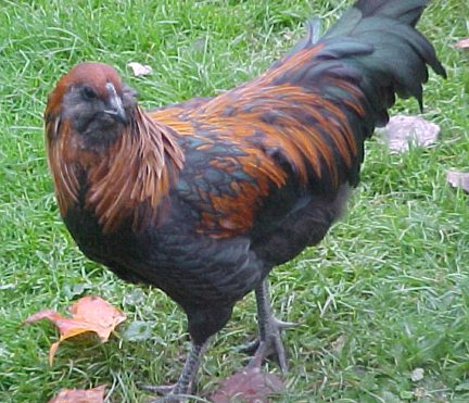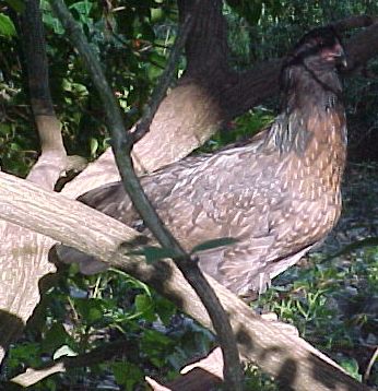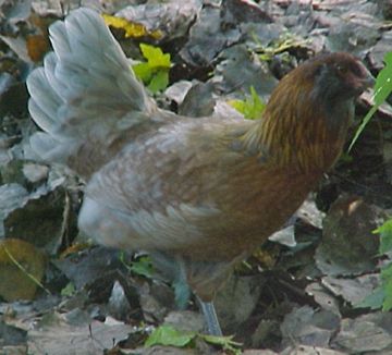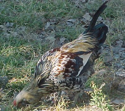 So, I am trying to establish a separate flock of Huastec and the gray birds (maybe a mottled blue is closer to the color, with an occasional darker gray or black feather and streaks of white in some feathers). My Huastec roo has striking white plumage, and with his adult molt he develop an overlay of pale gold rooster feathering across his back from neck to tail. He is gentle with us and the hens, and very good with young - helping the moms feed their chicks, but has not tolerated new roosters coming into his yard