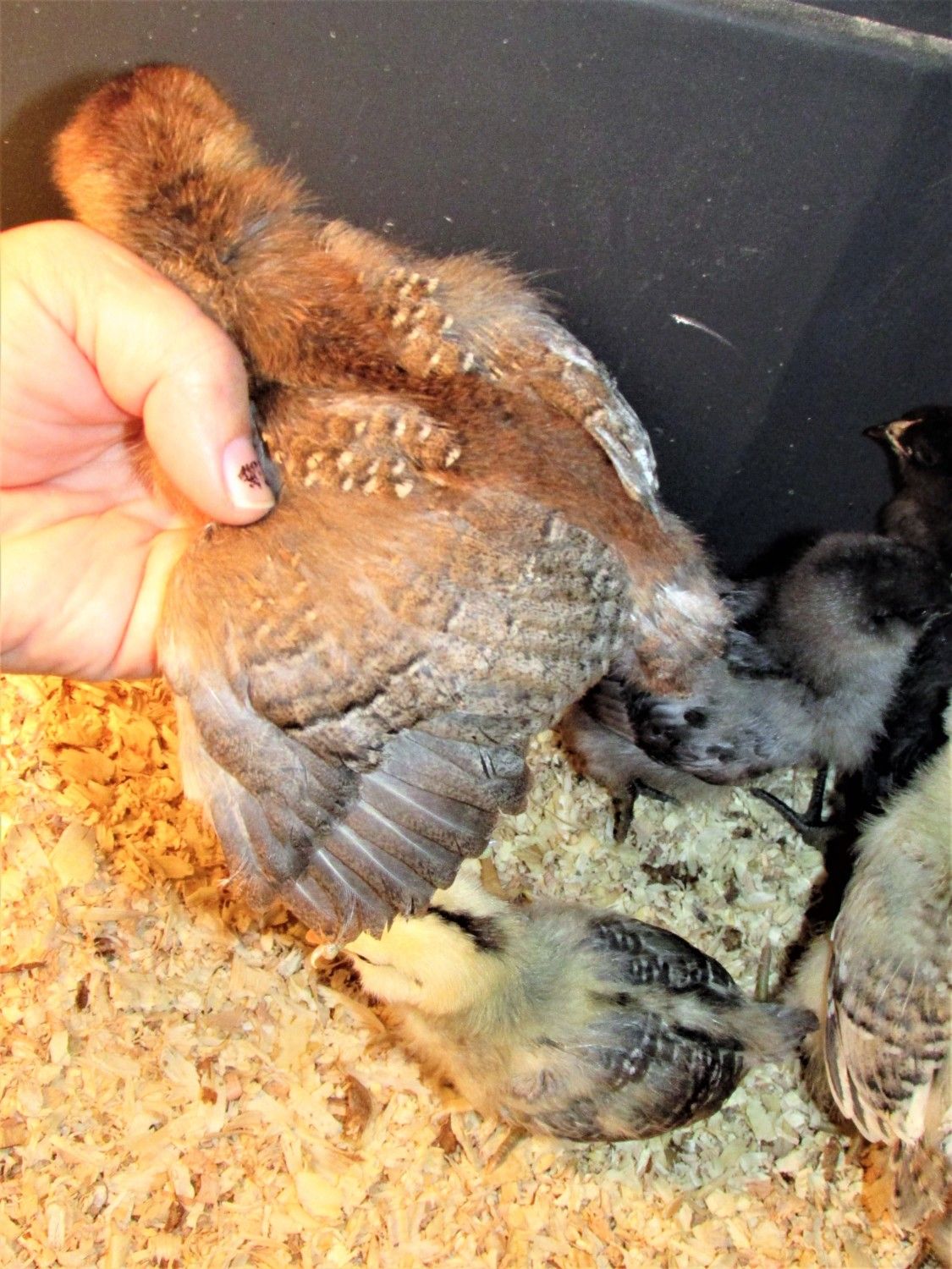 two possible moms..... half Splash Ameraucana half Marans (variety, unsure)