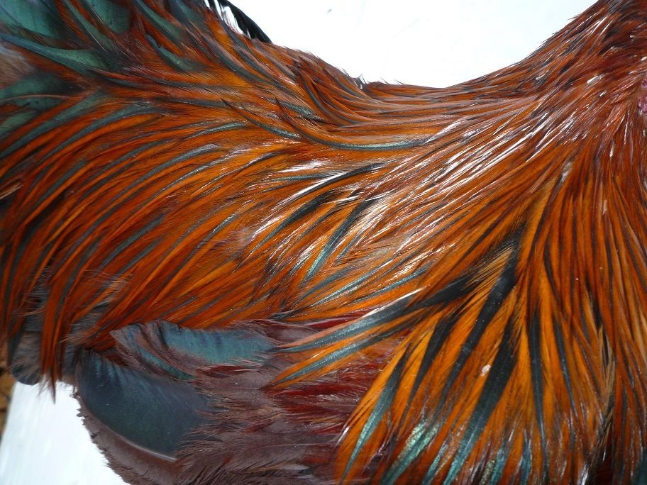 Does your male in question express pencillings like this in his saddle and hackle, but not crisp but fuzzy wuzzy? Parti boys are BLACK and red marked colour pattern. An exhibition Partridge male is rich brilliant red with beetle green black.