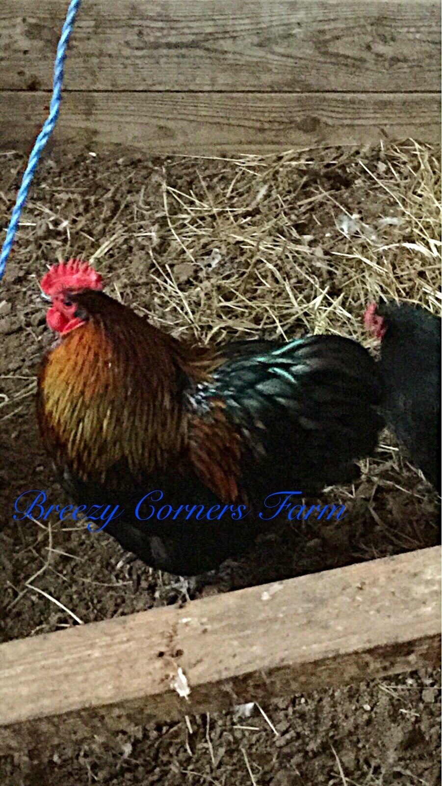This looks like a thread where I might be able to get an answer. I want to know what color this little bantam Orpington rooster is. His parents are American black bantam Orpington and English chocolate/black bantam Orpington. His wings are the iridescent blue/black like the hackles at his tail.