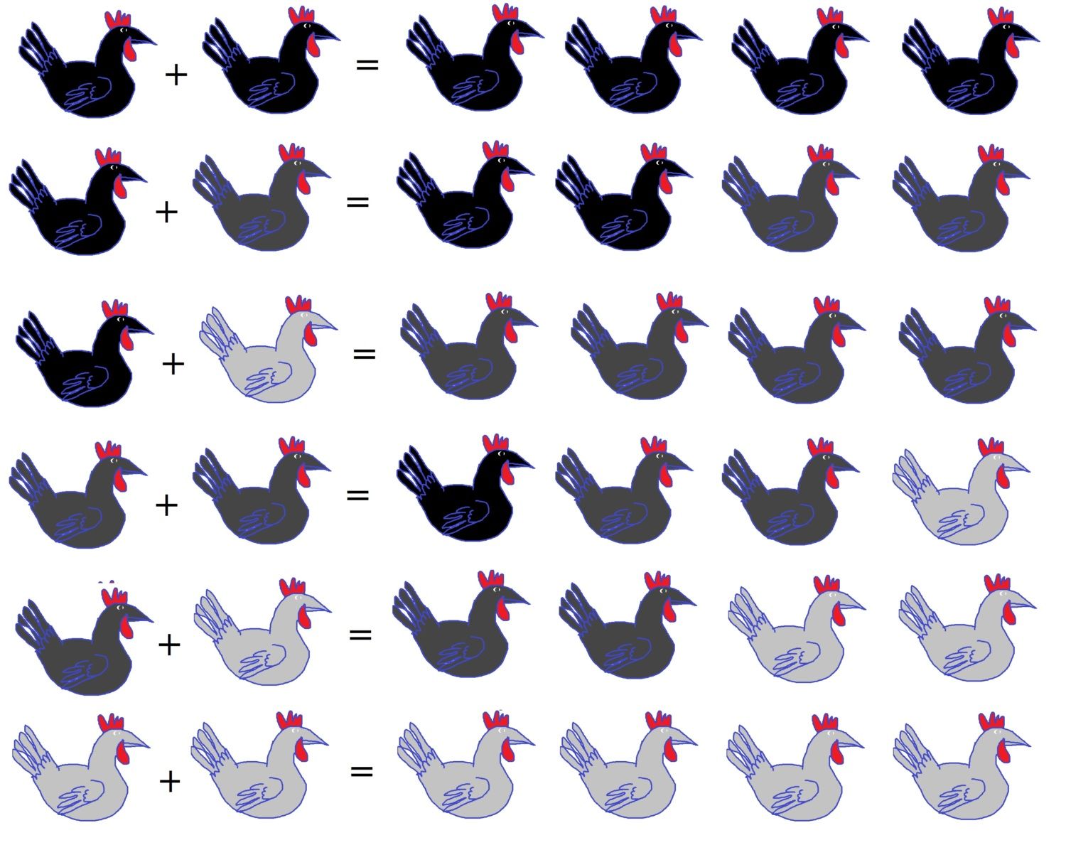 I use this chart as its a little easier to see the colors:@moving coops I totally understand. Don't feel bad. Sometimes visuals help. This chart assumes that the parent have two copies of black. The blue gene is added separately from the black gene... sort of like adding creamer to coffee I suppose. birds on the left are parents, birds on the right represent the colors of chicks you'll get.![]()