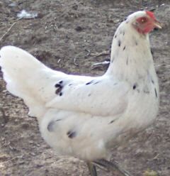 will be white with some red on their bodies. The red usually shows the most on the head and hackles and decreases toward the tail end of the bird. The white males may or may not show red on the shoulders and back. The rest of the adult offspring will be black and showing red. The amount of red the offspring show can vary.