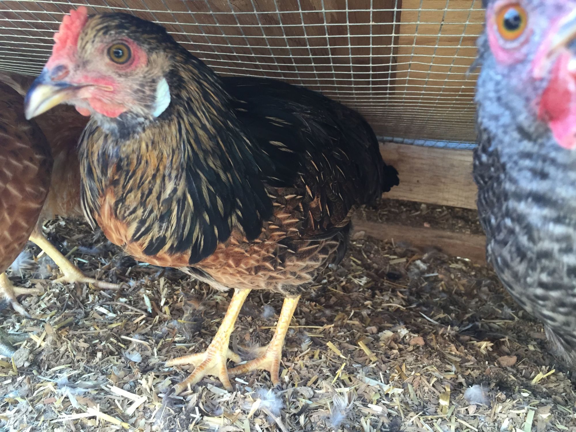 The Frizzle Easter Egger mom is likely a Splash with wild-type partridge pattern. The Brahma definitely has some mixed pattern genes. If he was a proper Blue Partridge, his chest would be solid blue. Brahma project colors are usually a real mess, genetically, and he is not an exception.