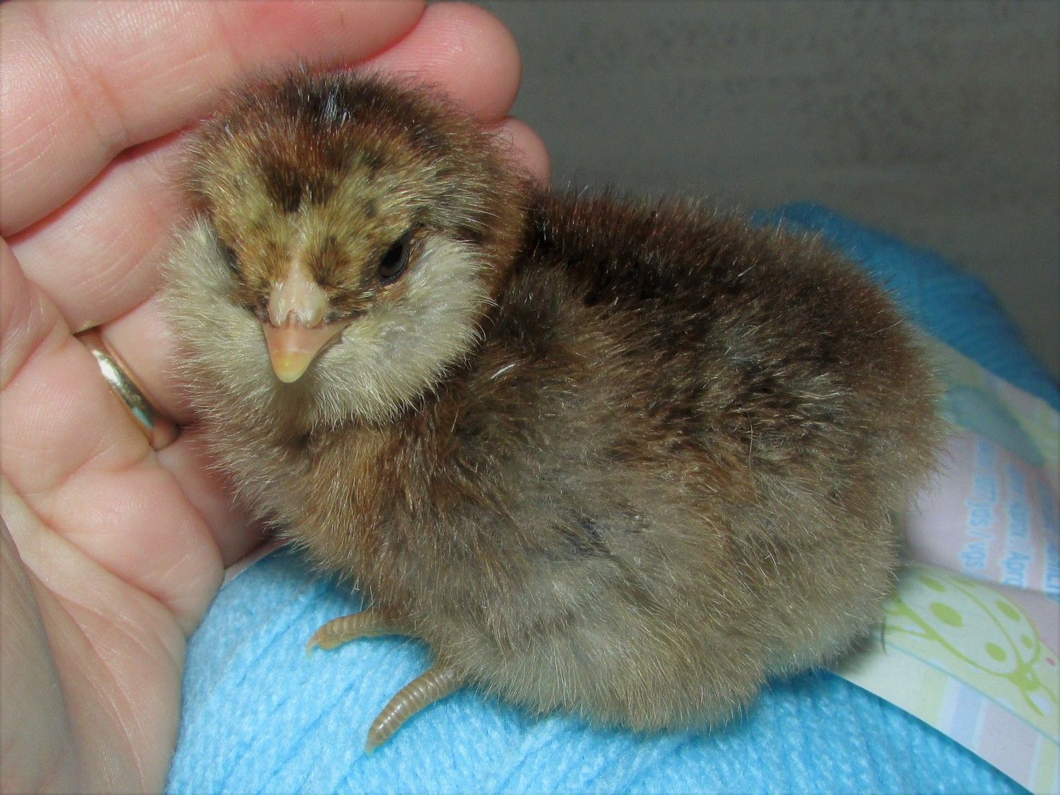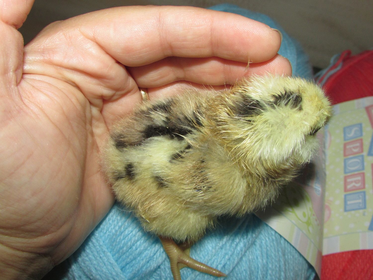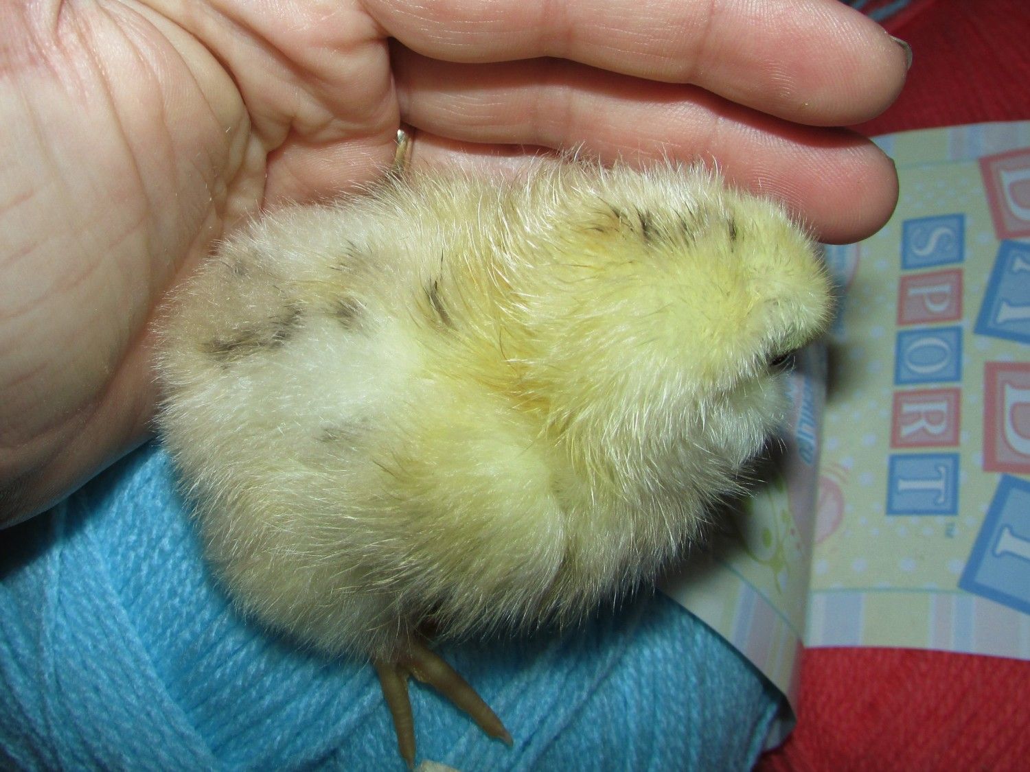 The pen the eggs came from is put together to produce chocolate(sex linked) silver birchen birds. There are silver based and gold based breeders. The pen has been known to throw mottled chicks occasionally. The owner said he "found out" one of the original hens for the project also somehow carried dun. I hatched all chocolate chicks except this one who was entirely yellow at hatch. Dun mottled maybe?