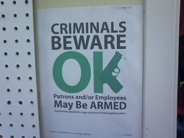 I know a couple of businesses that encourage concealed carry. I don't believe that they have a sign posted but I have seen those signs for sale.