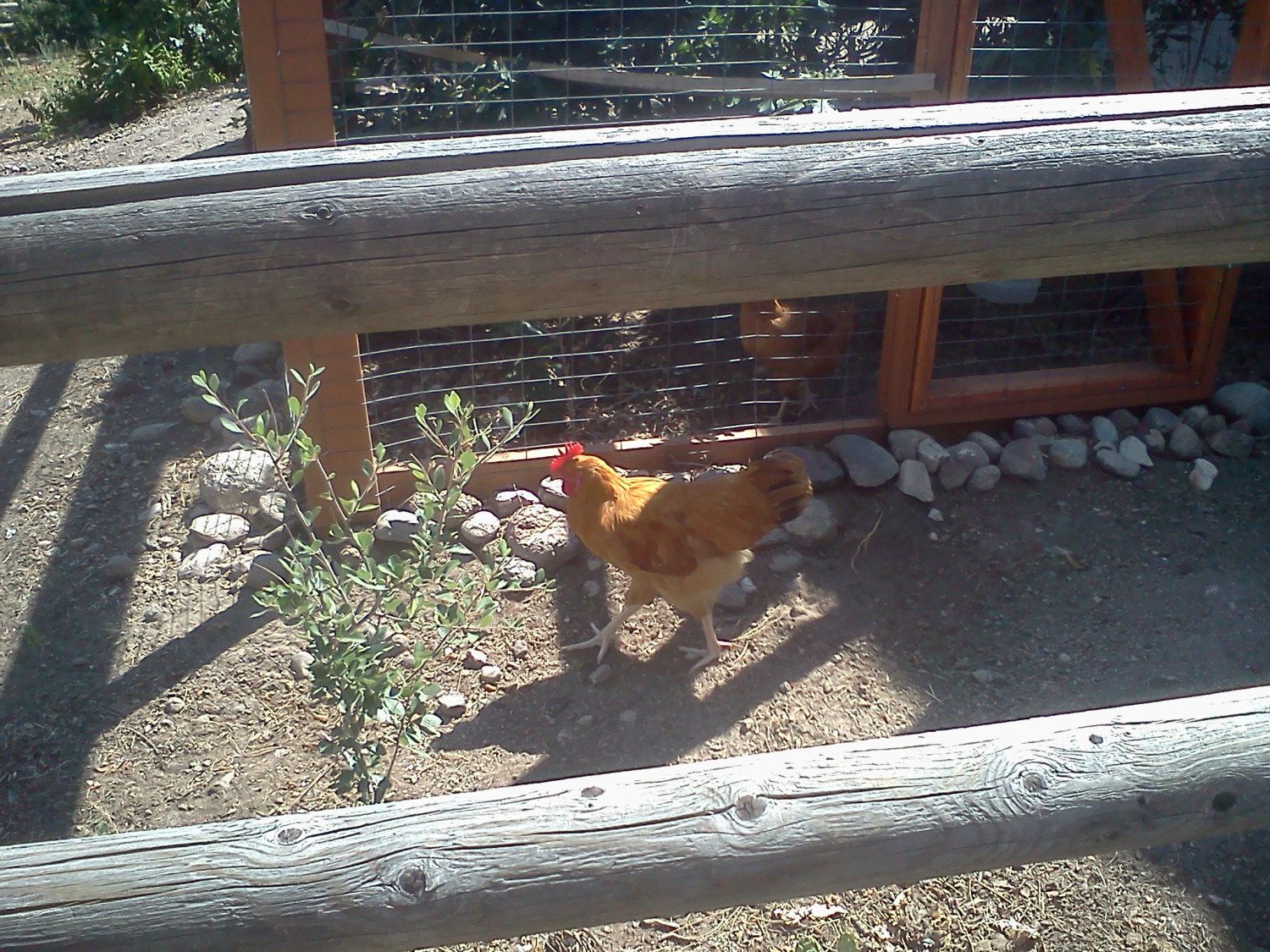 O.K. Kids. Yes, me again. Here are some lousy pics of the 3 chooks I think are Roo's. The gold, black, and turquoise with a rose comb is just a run-of-the-mill barnyard variety. He crows well after sunup and is going to get me in trouble with the HOA. The orange dude is a Buff Orpington who I have grown rather attached too. The other white-ish guy I was sure would be a Leghorn, he came from a white egg. Two of these guys need to go. They were all hatched 3/27 by a broody Ancona so are a bit skid-dish around folks. At this point I don't care which 2 go, but again, I'd kinda like to keep the B.O.