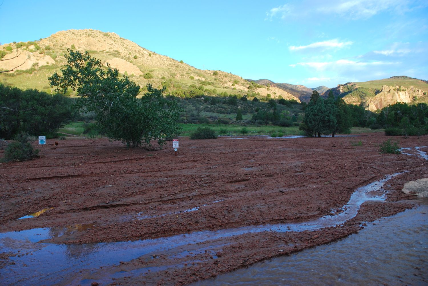 This area used to be a grassy little valley but is now under around three feet of mud. All traces of the original creek are gone (it was below those signs.)