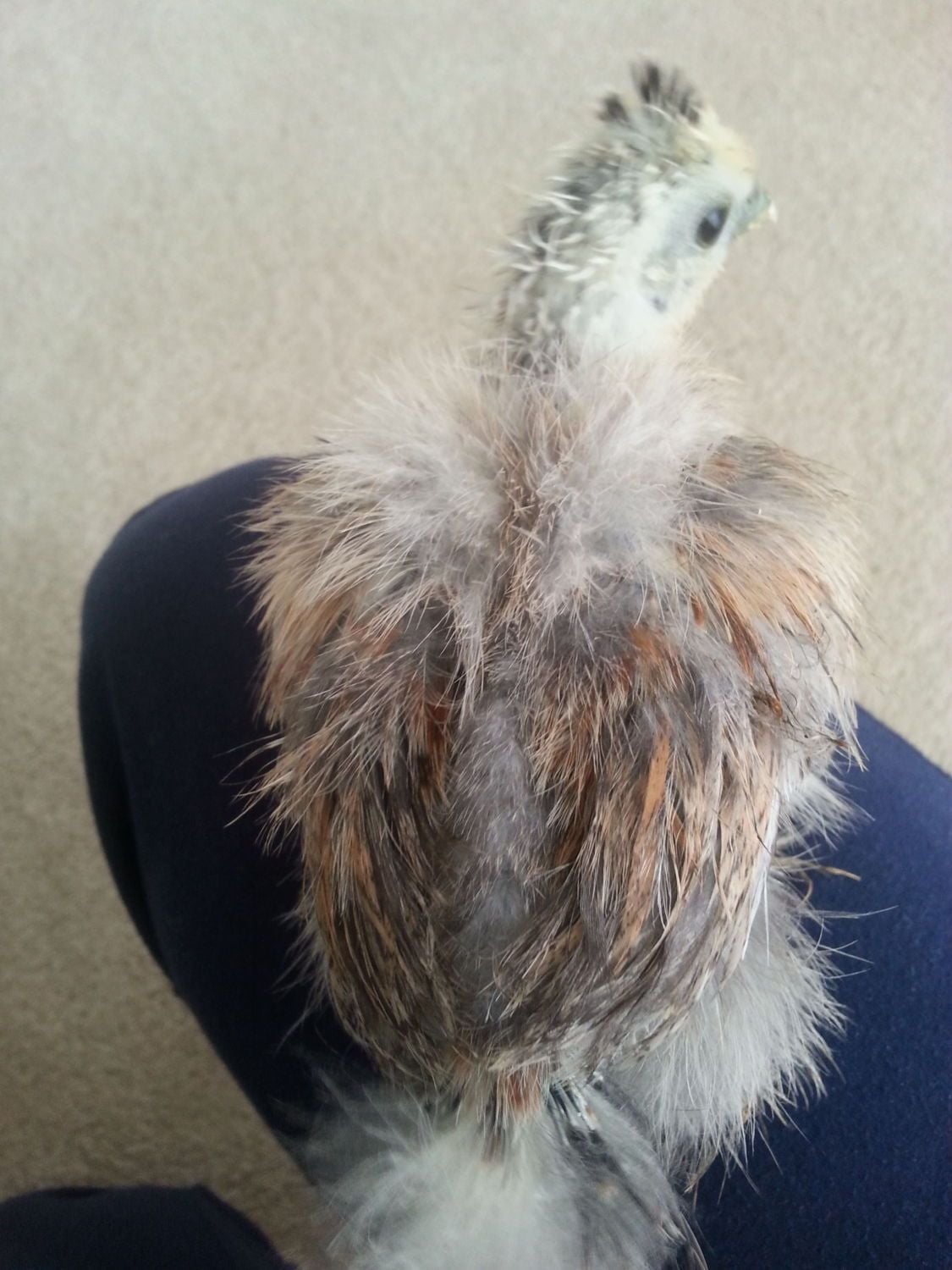 Here is the little silkie that we hatched from Pozees eggs that was white with black chipmunk stripes when it hatched. It's getting black head feathers. Definitely a silver partridge, or maybe even closer to plain partridge. We'll see.