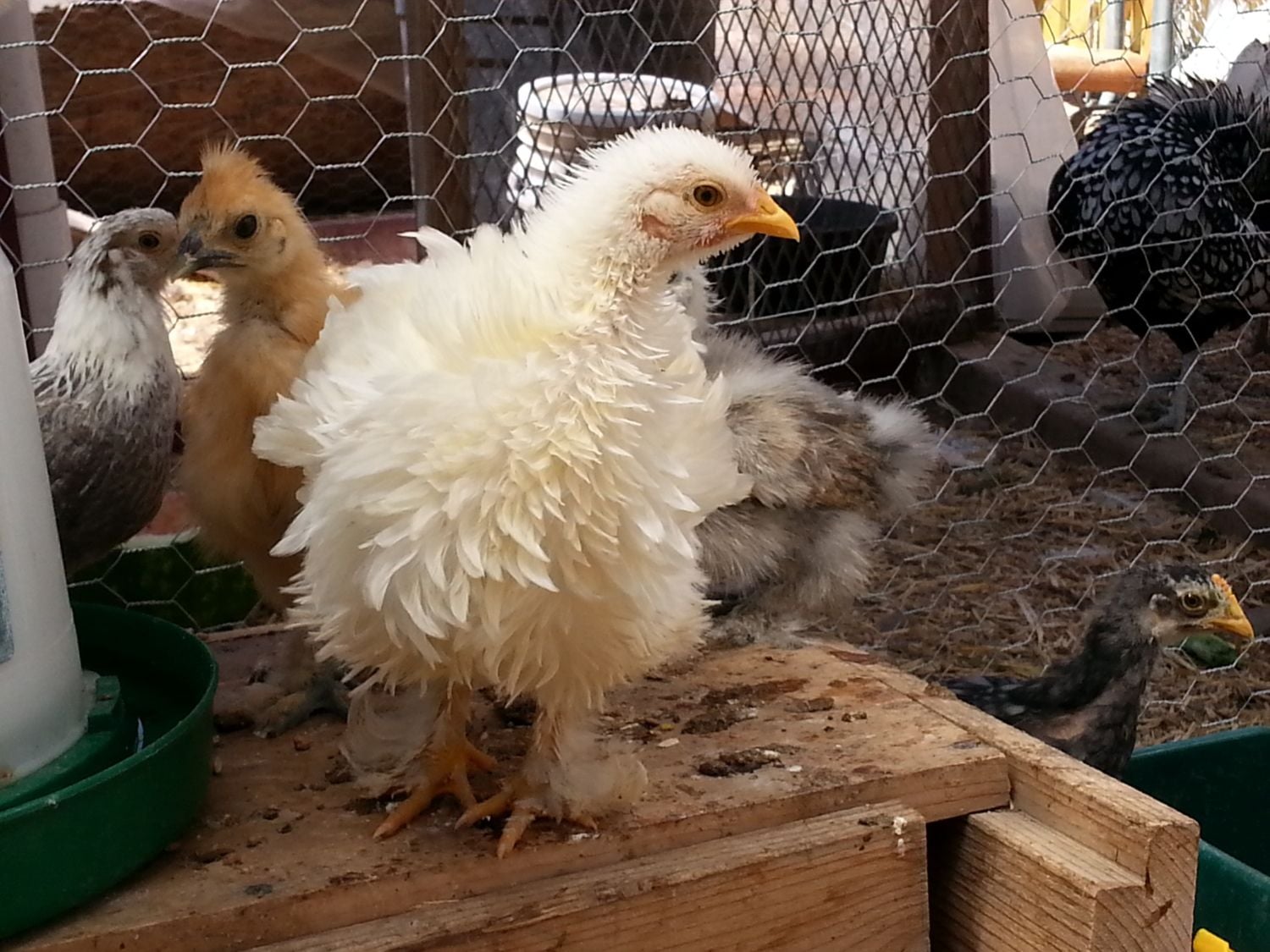 White bantam frizzle cochin from Kiowa Country Corner. With a buff silkie from the same place behind her (friend in KS is taking her)