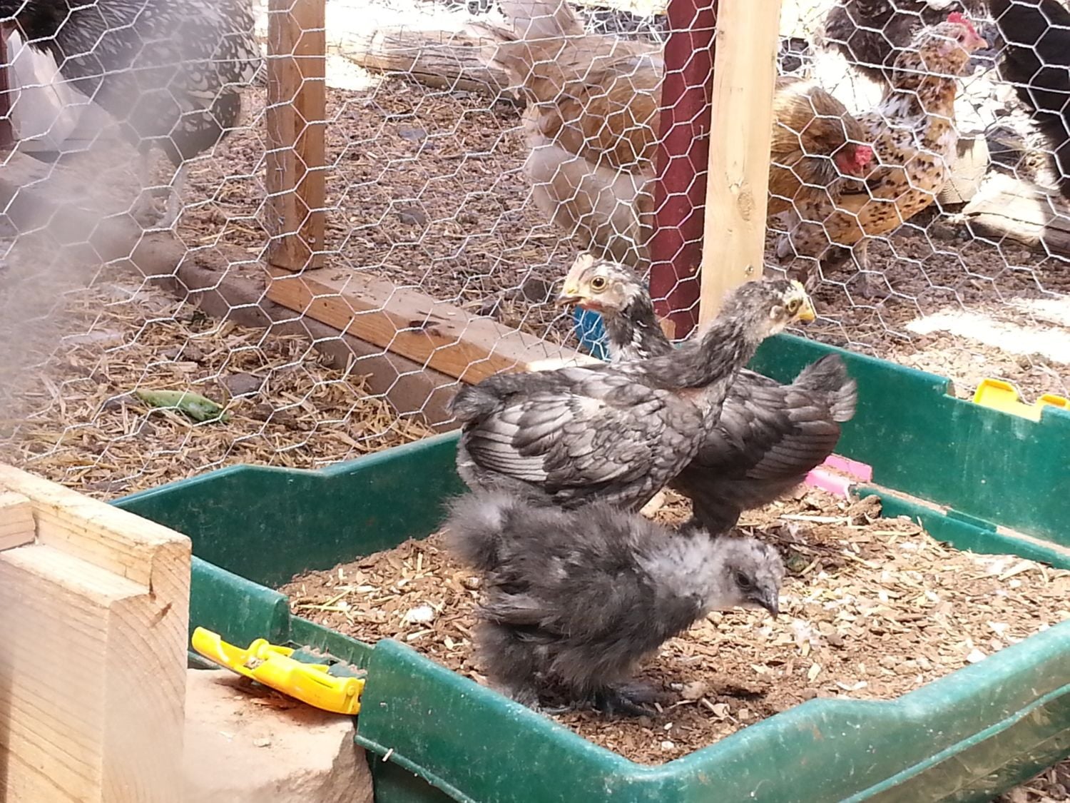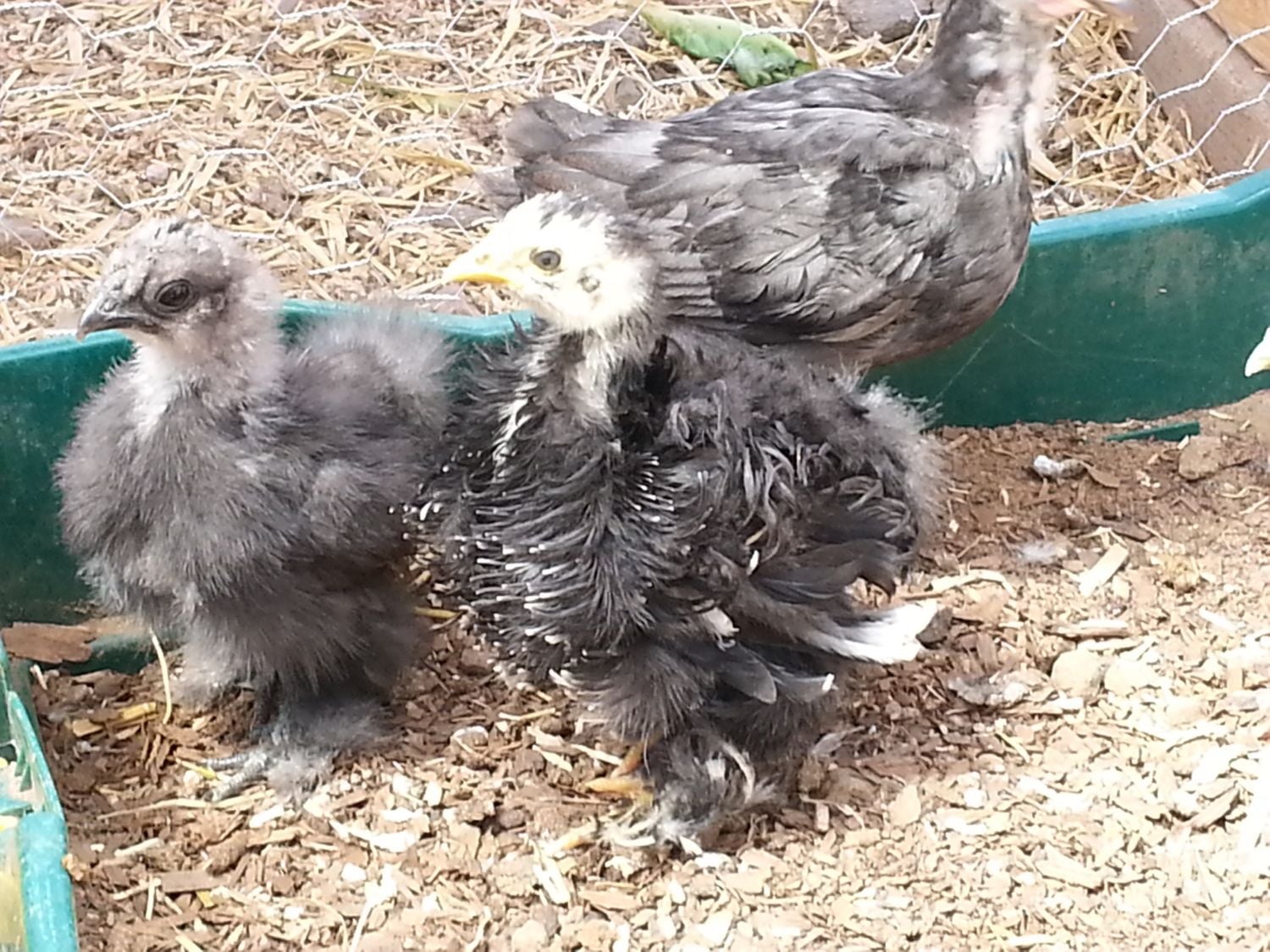 Hard to see but this is a black/blue silkie (not enough feathers to really tell which yet) from Pozees eggs and the maranx rooster and what was marked as a javaX. The Java is in the middle. It is getting the prettiest feathers. They are a dark blue with black lacing. Our real estate agent is buying her. I'm a little disappointed because I want to see how she turns out.