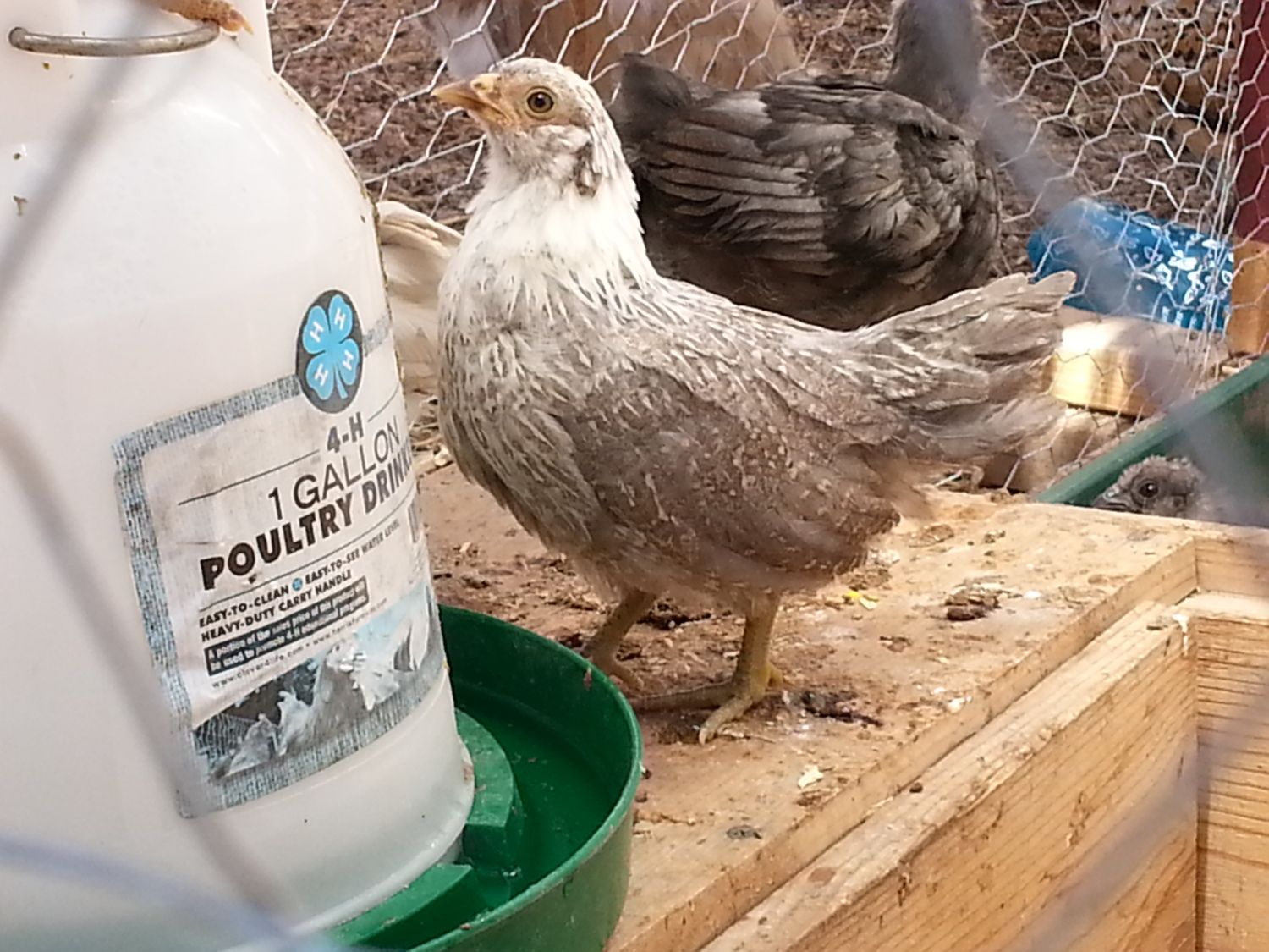 Our mystery chick that turned out to be a welsummer, stretching her wing. She loves to sit on top of the waterer. She is the most docile bird and lets the younger ones push her around.