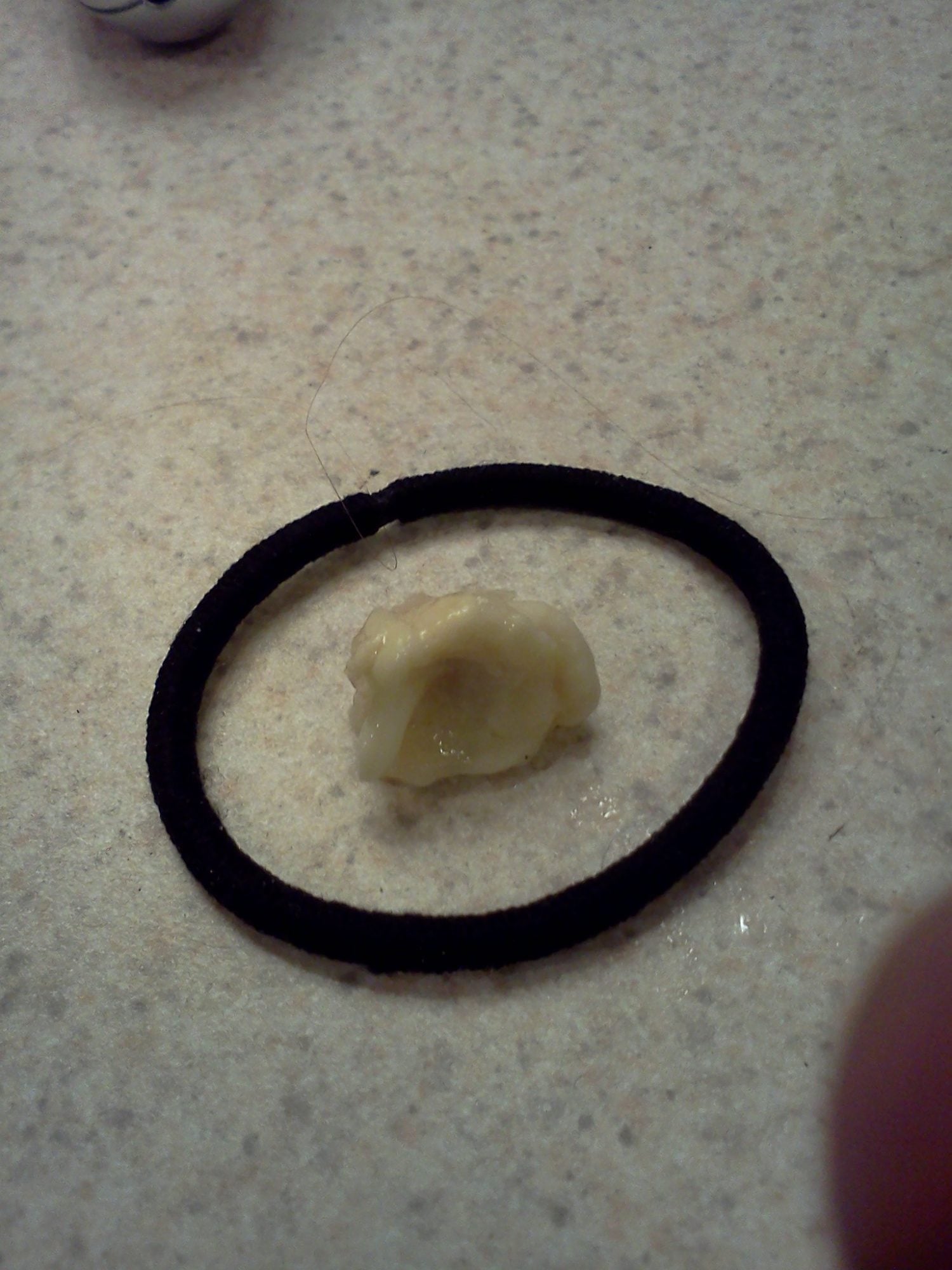 Here is the chunk that came out. I couldn't find anything in my bathroom to give it scale except a fat hair tie thingy.