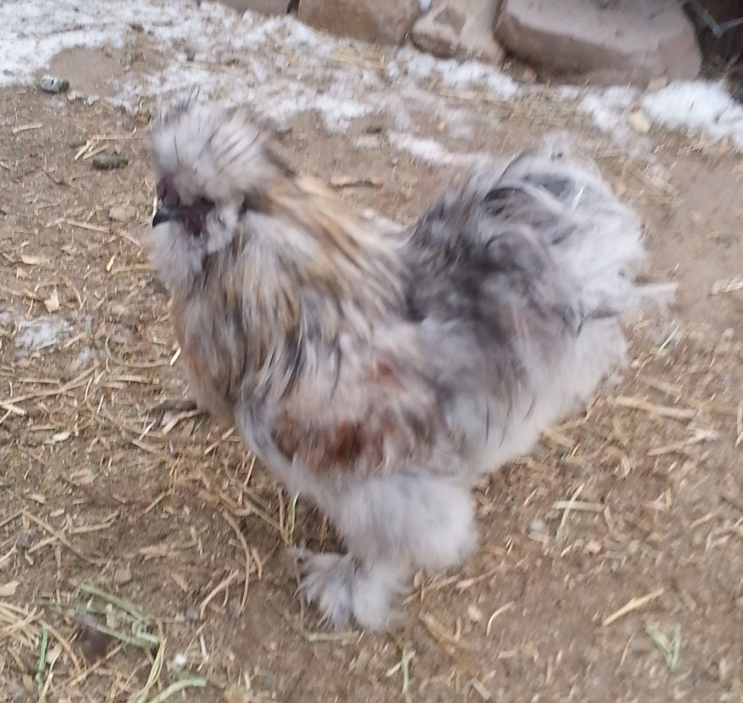 This is my silkie, no comb at all, just tons of feathers, not the best picture, but all I have right now. He has bright blue near his wattles. I know nothing about this breed, so not sure what sex it is???? lol