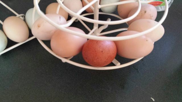 I got this pic from my husband today. Our BCM (get her as a chick from pozees) finally laid her first egg. DH caught her still on it so I know it was her. Not as dark as it could be but I'm happy with it. Adds a new dimension to the skelter. :)