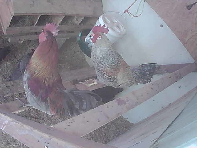 [COLOR=333333]My friend is supposed to go out and see some people's place this weekend that might let her keep her chickens there. Yeah! They are much closer to her so that will be nice that she'll get to see them and take care of them herself. And I'll get to split up my roosters.[/COLOR] [COLOR=333333]Here is a pic from the coop cam. You can see the Maran roo's comb is still healing. While I've seen the CCL roo go after the maran before I think for the most part they get along. I'm hoping I can just separate the silkie roos out and everyone will get along. [/COLOR] [COLOR=333333] [/COLOR]