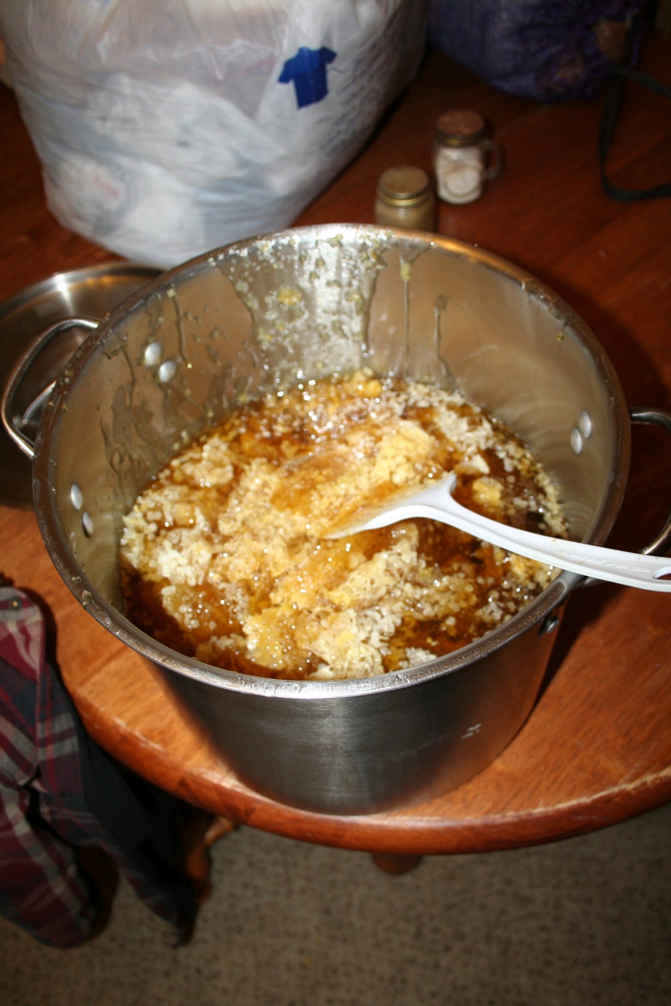 Altogether a rather good start since this is my first year. I had been told to not expect any honey or maybe just a little. That pot 1/2 full weighed out at 26.2 pounds (wax & honey combined)! If there's 6 pounds of wax there, that leaves me with 20 pounds of honey! I'm very happy with those results! I just wish I had been more of a bee keeper and less of a "bee haver" The other hive might have survived and I'd have twice this amount.