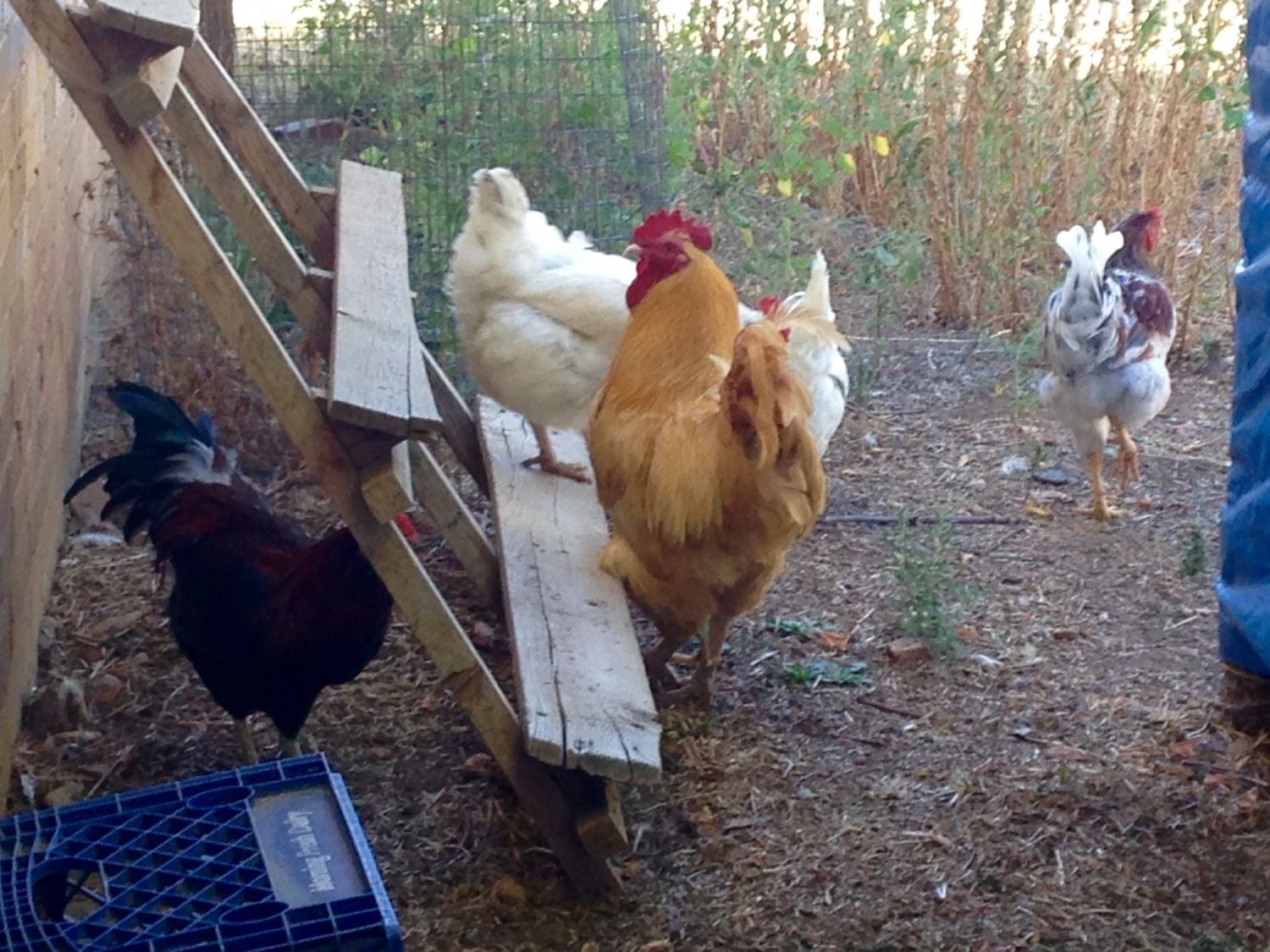 So we have taken the first steps towards our selection of a replacement roo. Colonel White is now blocked off from the rest of the flock. He had been exhibiting some roughish roo behaviors and they will not be tolerated. He will be fattened up and processed before October. He is merciously chasing our broody girl all over and is very rough. Lots of feathers lost on her, so his fate is sealed. The other two are still being gentleman, tidbiting now and the grey one is starting to do the wing drop with the ladies.![]()