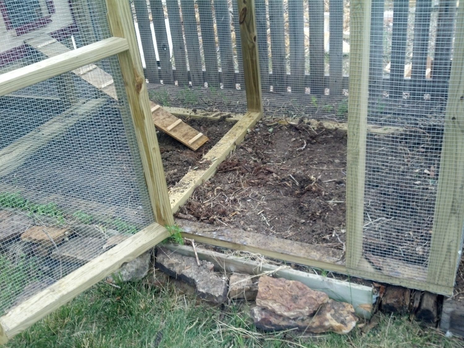 Honestly, with your setup I would probably just fill it in with dirt the the level of the 2x4s. The girls really enjoy scratching around in the dirt, looking for bugs and rocks, and mine haven't been very happy in the wire-bottomed tractor because it keeps them from doing those normal chicken behaviours. If you just give them a few inches of dirt they can get that satisfaction while still keeping them safe from burrowing predators. Then they can make their own little dustbathing areas as well. Just a thought.