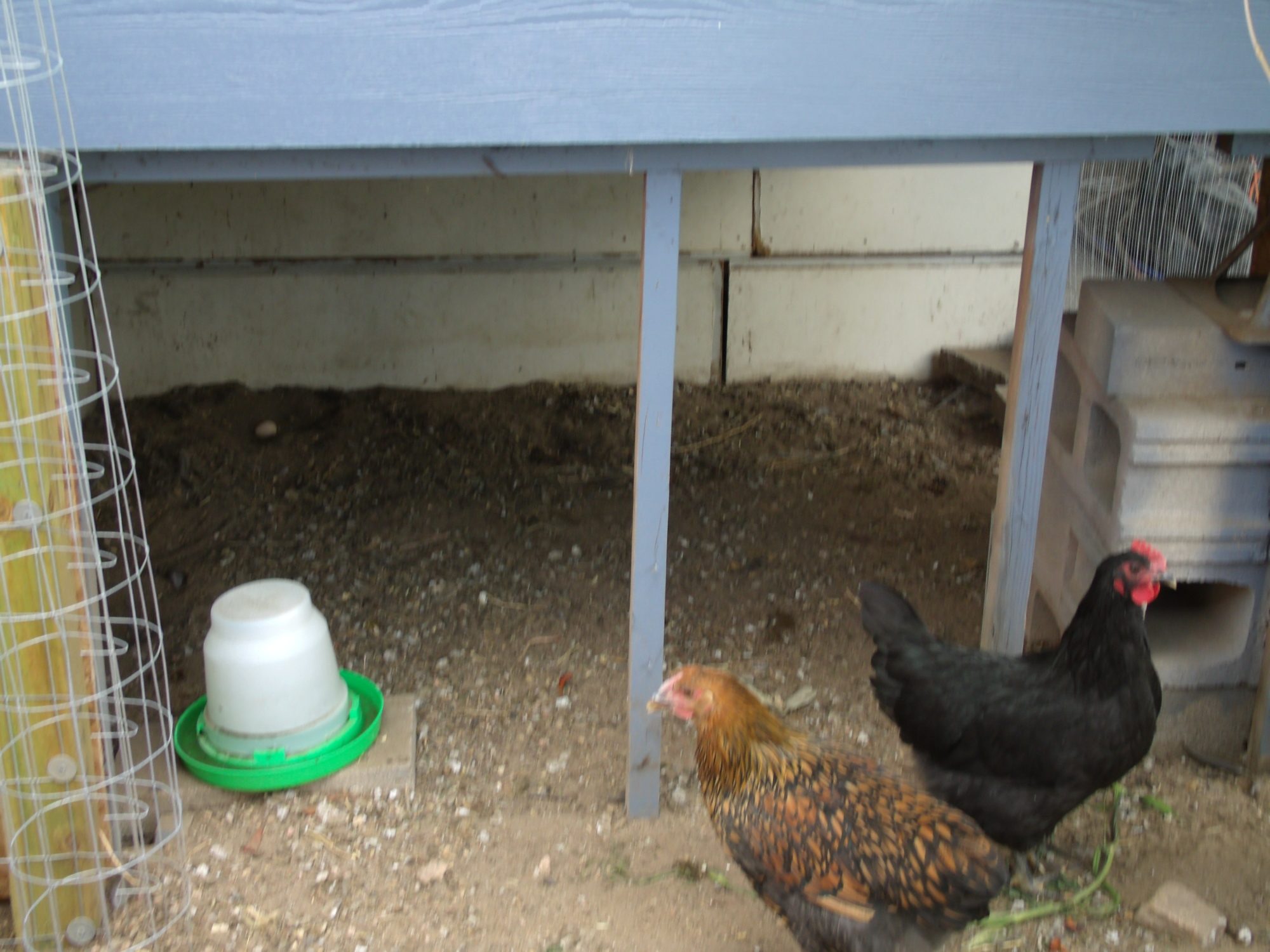 OK, too much excitement for me. By now I've lost interest in separating the coop/run, I'll do it tomorrow. I fix lunch, then about 1:30 Dennahrl comes over to get the linoleum I had, spent a little time with her and her two beautiful girls. After she left, I got my second wind, and there were no pullets in the coop, but they made their nest hole about 50% larger, so I went in to put in my separator. Took out the food storage bins I have in there to give the new birds more room, pounded in 4 stakes to hold up the chicken wire. Now I just have one problem. I've got to get the new guys some shade. I only have one area in my run that gets shade during the heat of the day, and it's in a corner under my house, not shareable by two flocks. It's a great spot, open into the run and also open (with wire) onto my patio so that I can sit and watch the girls do all their dust bathing. Here it is: