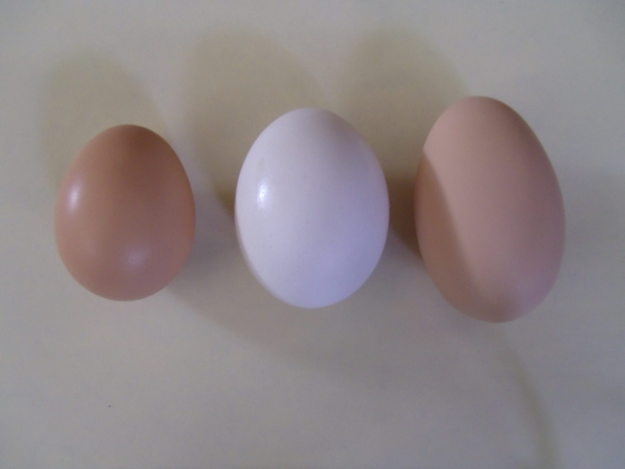 So this morning, no song. But I go out about 9:00 am and this is what I found. Egg on the left is the egg from 2 days ago, center is store bought large, egg on right is today's. I think she musta worked extra hard to get this one out.