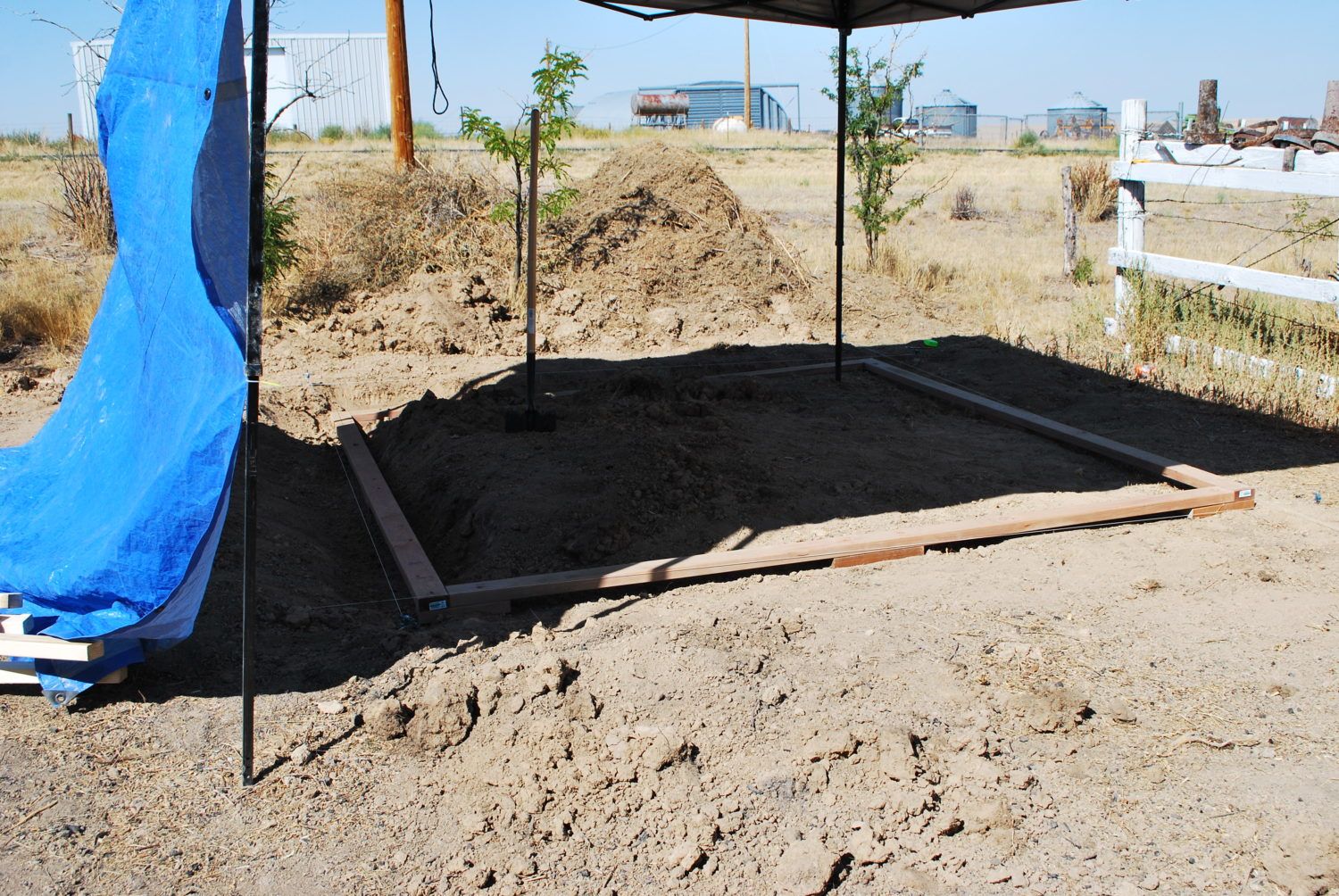 This is the last picture I took today, but we got further. This is the base that has had rebar put through it to help keep the shed from blowing away. The center has been dug out. The floor frame is on top of it and nailed down to the base and half of the plywood flooring is down.