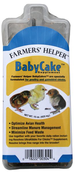 ers of Farmers’ Helper ForageCakes recommend starting your new chicks off on the Farmers’ Helper BabyCake and Farmers’ Helper UltraKibble for Chicks, used together with a chick starter. Then once the chickens transition from chick to adult they can move up to the Farmers’ Helper UltraKibble and Farmers’ Helper ForageCake, again used in conjunction with a maintenance feed. The Farmers’ Helper UltraKibble is mixed in a specific ratio (depending on breed) with the maintenance feed and the Farmers’ Helper ForageCake (Original or Optimal) is put out for ad
