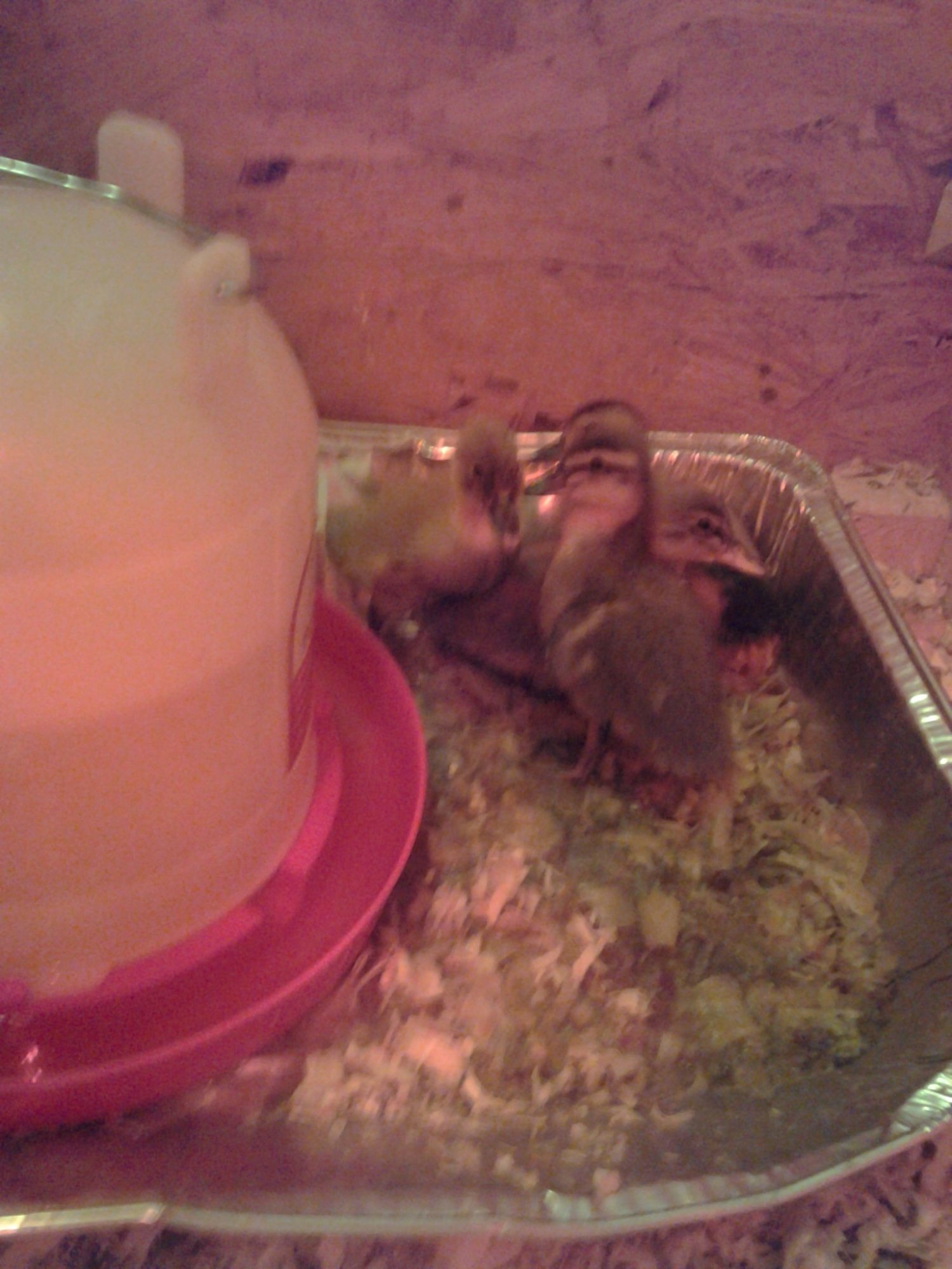 slick surfaces like you have can cause leg problems. best to use old clean towels or the rubber shelf liner. and the grate over the pan where their water and food is can they walk on it okay? I'd be worried they may get their legs caught when so tiny. Sorry if I sound critical I'm not just wanting to share some things I've learned and hopefully help. They look adorable need more pics,.hi, i really hope you don't mind me hijacking your thread, but i just hatched ducklings about 12 days ago, and thought you'd like to see my set up......