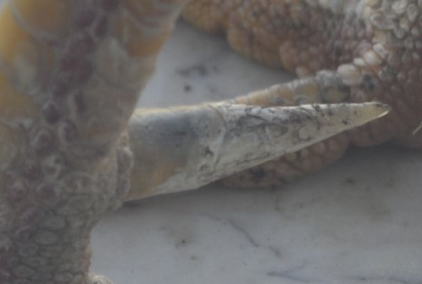 Are the ends brittle? The ends look like they could just break off. I tried trimming one of my roosters spurs once and only 1/4 inch in I got blood, obviously there was blood flow at that point. Could blood flow have stopped to the quick in the spur? About half way down the thicker portion it looks discolored.