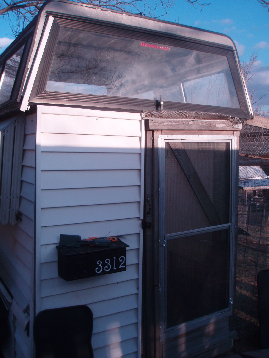 the oldest coop has a aluminum truck topper or cap on it for a roof... It has a crankout window on each side...
