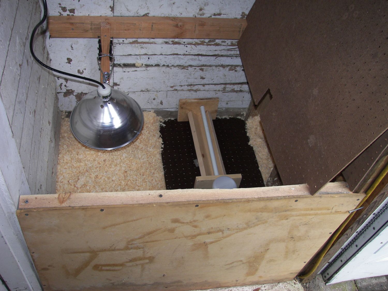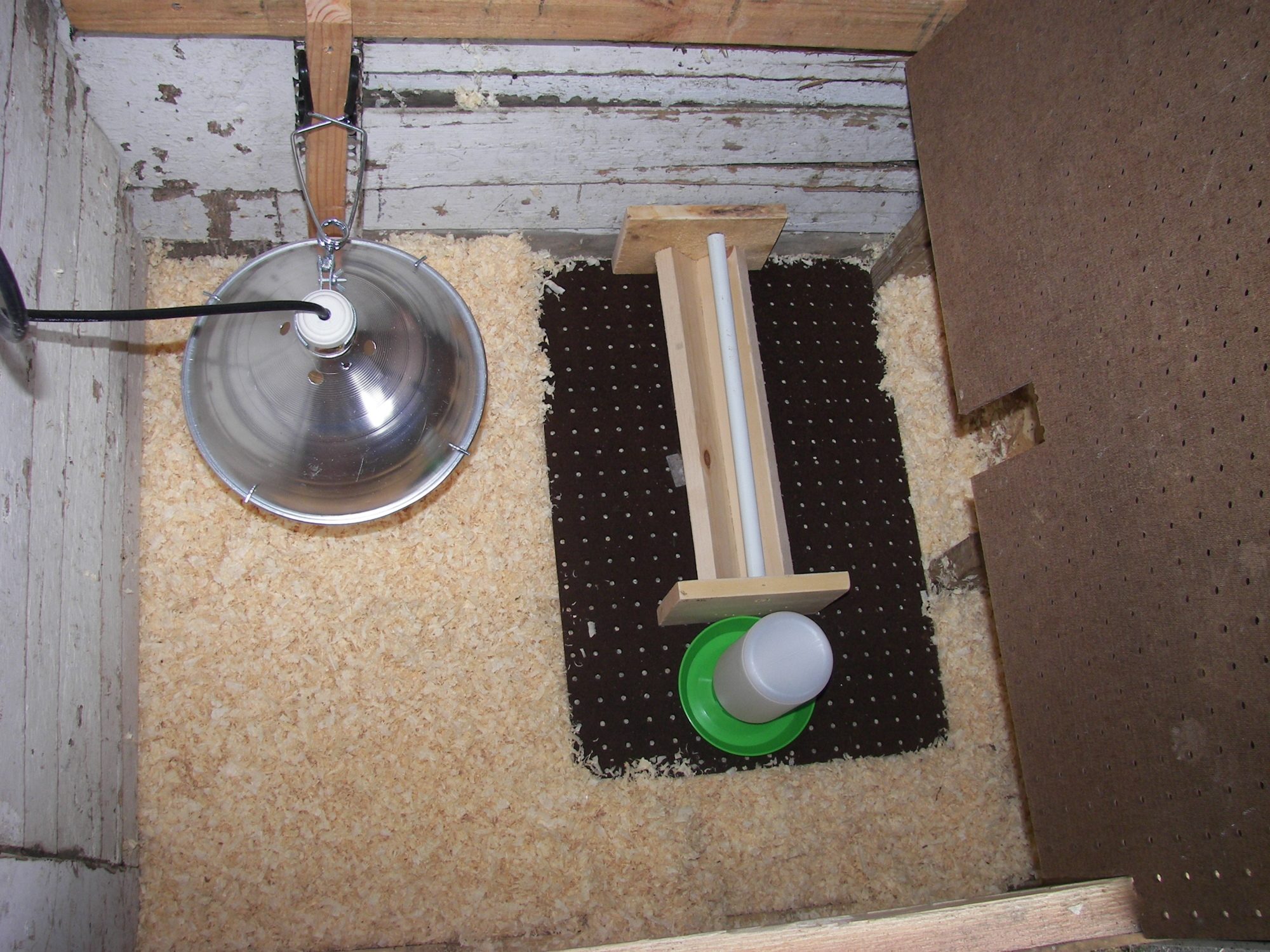 Adjustable brood lamp base. It can be lowered in 1" increments. If it does get too cold, I have the ability to add another lamp.