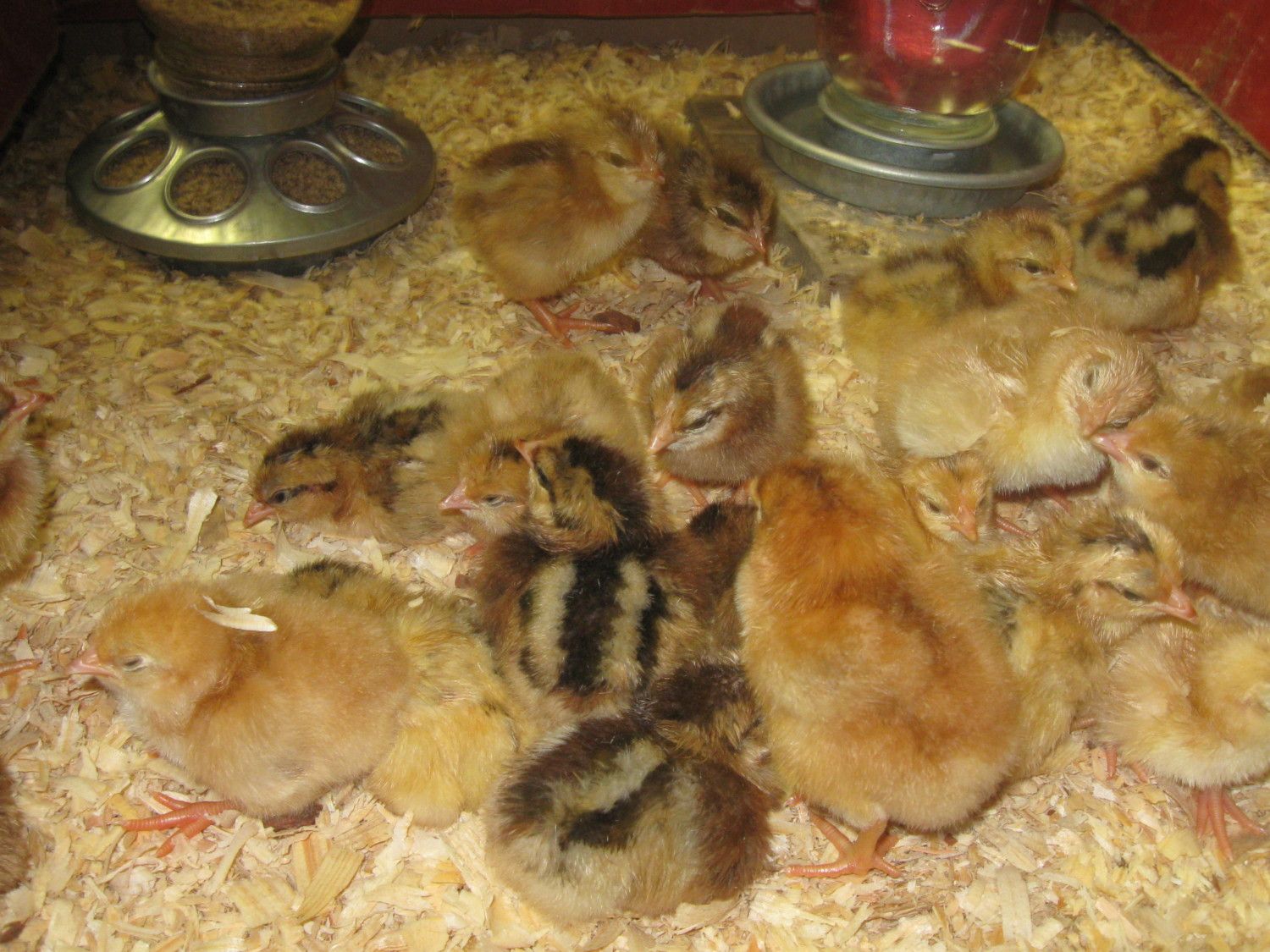 You can tell some of them were crossed with Speckled Sussex by the little chipmunky stripes. It's kind of hard to tell from the pic but some of them have a really lemon/mustard yellow cast to them. It's going to be so interesting to see how they color up. Can't wait!