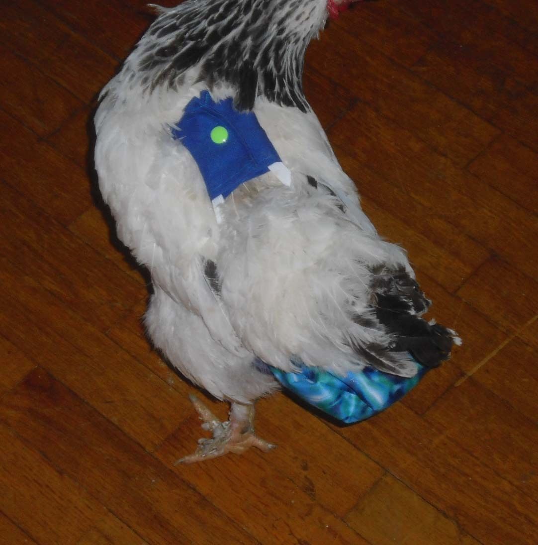 Had to show some pictures of Hawkeye's handiwork. Once I figured out how to put it on her, I let my little Brahma hen that had the broken leg model the diaper Hawkeye made. The dark on her head is pine tar. A couple weeks ago I let her out in the yard and the roosters tore a chunk out of her head. No success for a duck diaper but the chicken diaper works great.