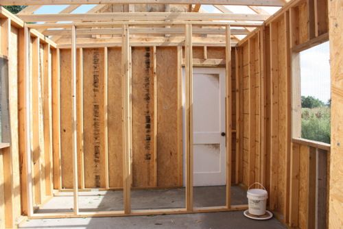 Here is a pic of the inside. The internal wall structure is up. I have the door but didn't have the hinges to install it yesterday, so that will be a project for next time too. The internal wall divides my 4x10 storage area from the 10x10 coop area. The bottom half of the wall will be 1/4" plywood, to prevent the birds kicking bedding from their side into mine. The upper half will be chicken wire. Since it is not a load bearing wall, I spaced the studs a little further apart than the 16" OC I would have done if I were sheeting it or putting up drywall. The door frame is roughly in the center.
