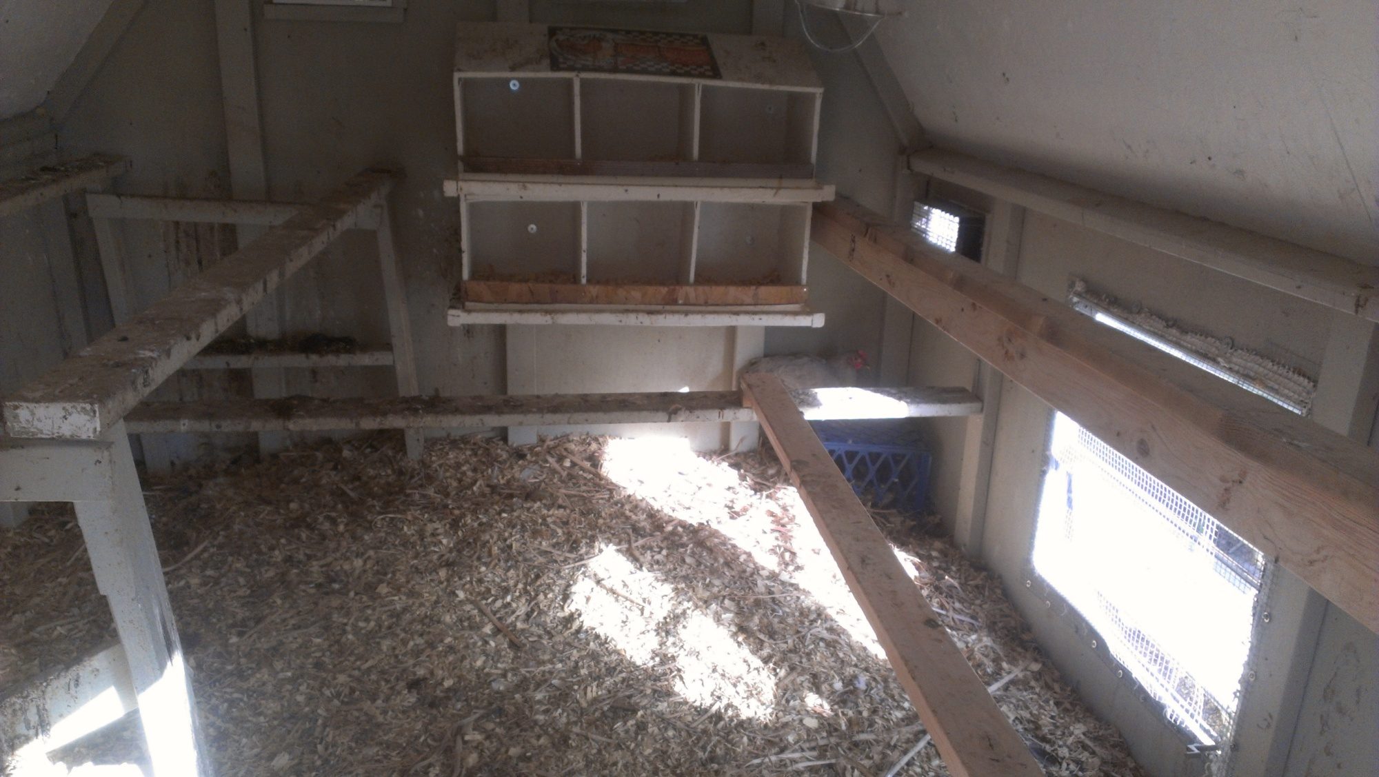 KarenS, you asked for pics of my roosts, so here goes. Just ignore the messy one on the left, it's the old one & it's dirty. I put up the new one on the right & decided they needed a step to help them get up there & get down easier so as not to hurt their feet & they do use the step. I went in to close the door tonight because it didn't close & the young chickens were all on the new roost. It's so funny, they're segregated, older ones on the left side & younger ones on the right. I even noticed the new little lavender orp roo was up there tonight, he is already getting in good with the young girls!