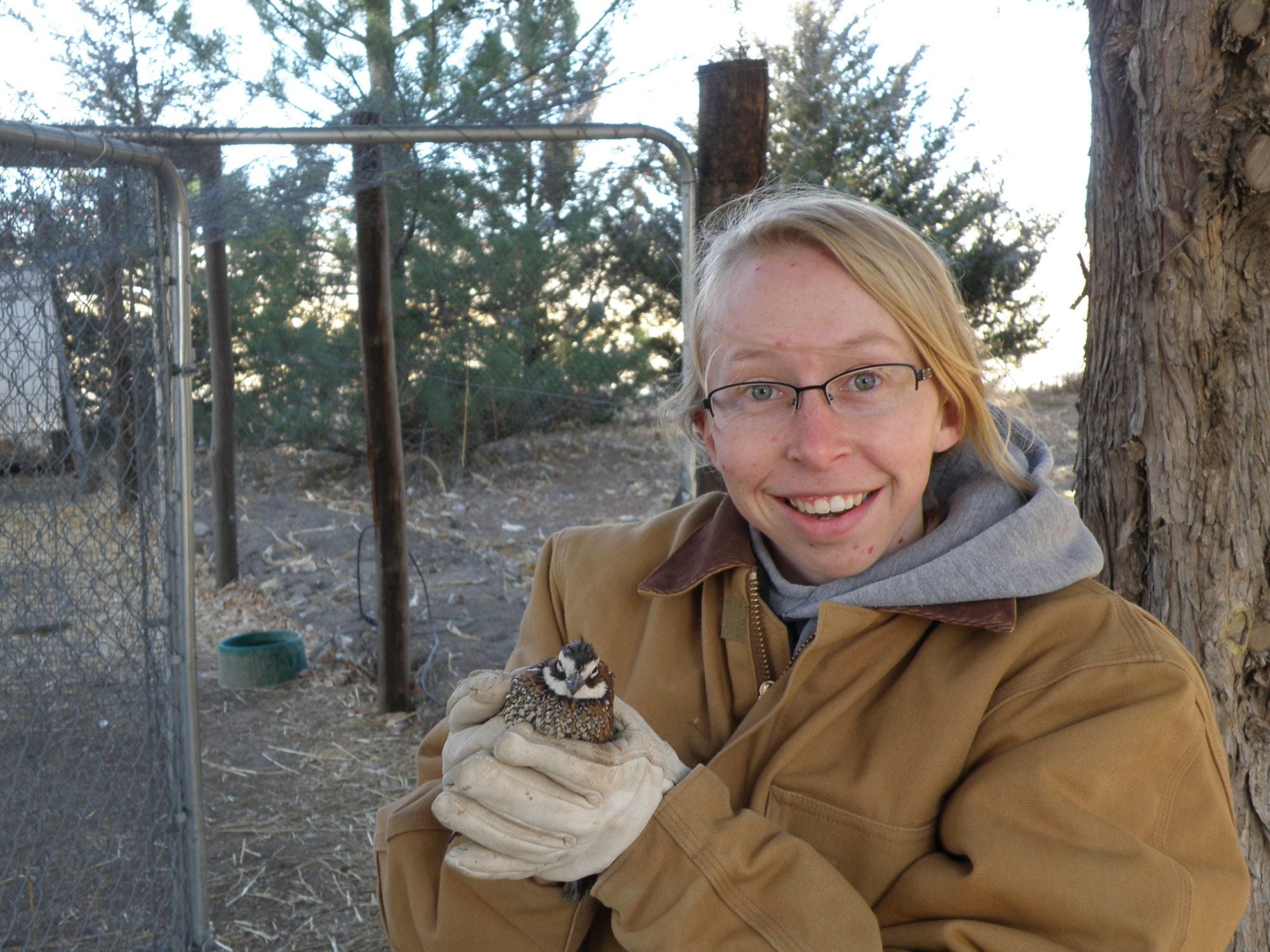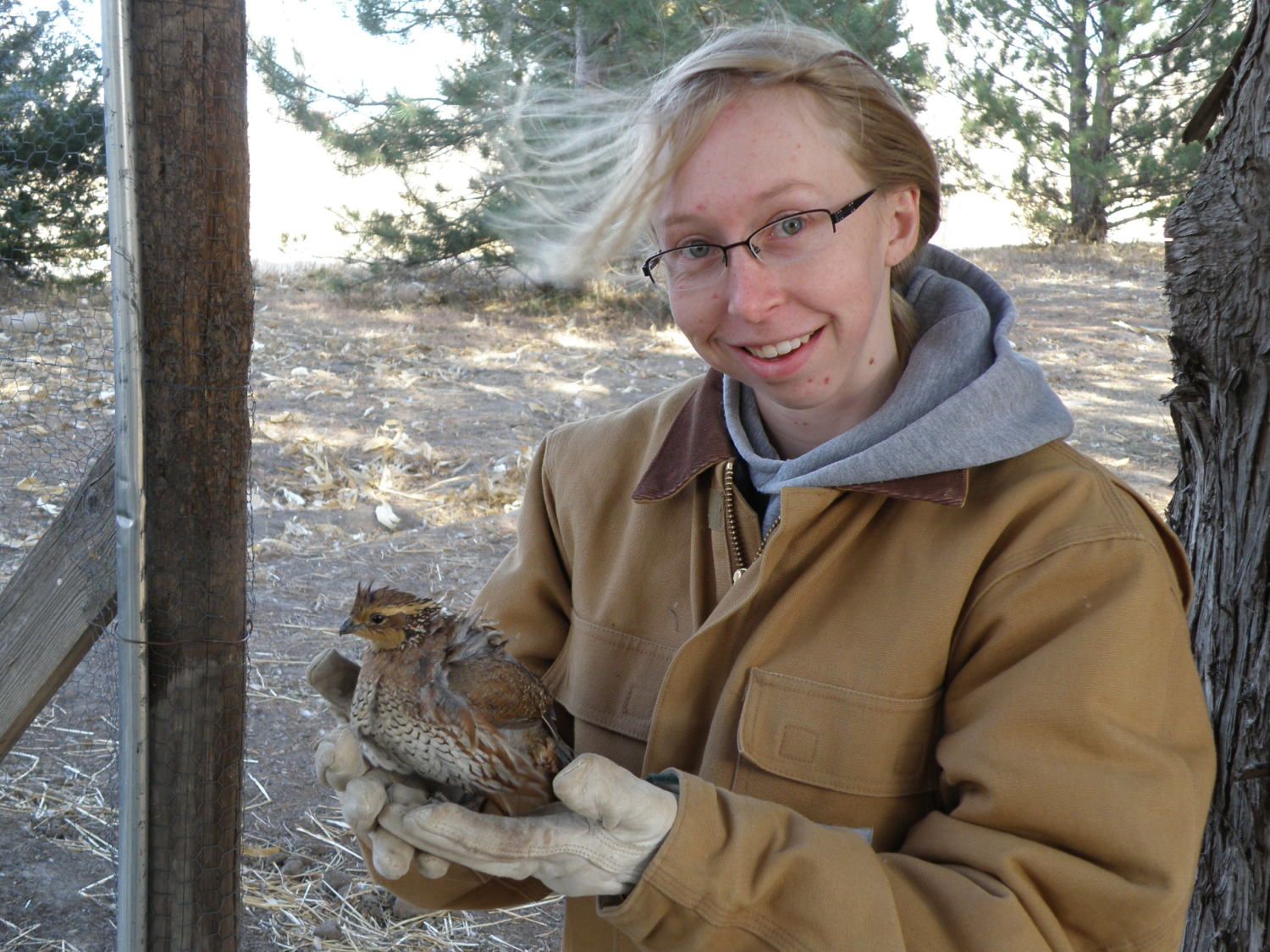 Last night, I made a dumb mistake. I thought I'd share so others can laugh at/with me. I started filling the stock tank (water) for my horses last night. Then, I went and got one of the horses to play with. Not long after I started playing with the horse, I realized that I had forgotten the water, so I just turned it off, leaving the end of the hose in the tank. We are on well water, and after I turned the water off, the siphon from the pump started sucking the water out of the tank. When I got up this morning, I had a frozen hose and only 6-12 inches of water in the bottom of the stock tank. GRRR!! So, I had to move the hose to a sunny location and let it thaw out so I could water the horses again today. Just a few minutes ago, I went out to water the horses and walked right past the duck run. Much to my surprise, there were 3 quail in there. I shut the door and ran to get my DH, who is a hunter. We caught a couple of the birds (one flew out) and took some pictures with them. I've included a couple of the best ones below. To clarify here, the neighbor down the road owns a lot of property, which we happen to be right in the middle of. This time of year, they host a lot of hunters, who come to hunt deer, pheasant, quail, etc. The neighbors "plant" pheasant and quail for the hunters to hunt. Since we are so close, we often discover some of these birds in our treeline. My duck run sits amongst the trees, so it isn't a far stretch to discover some of these birds in my duck run.