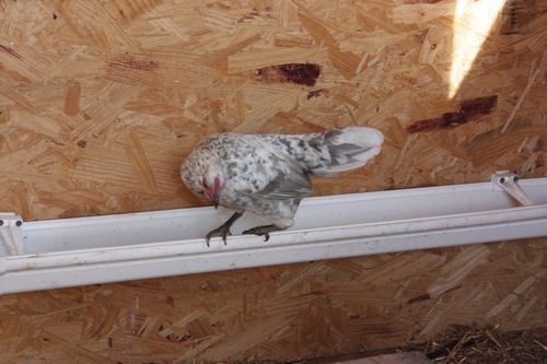 And last, this is a terrible pic because she saw me coming and was in a hurry to turn around and get down before I could get too close but.....this is the gutter feeder I installed in the coop. The LF can stand on the ground to eat comfortably. The cochins and silkies stand on their tippy toes and can reach in to eat. These 3 little guys just jump up and stand ON the gutter to eat.