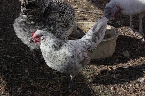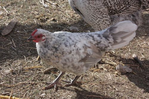 And here is the other little unknown hen. I actually think she's very pretty - love the mottled lavender - but don't have a clue what she is. For size comparison, I wish I could have got all three of them in the pic at the same time - she is exactly the same size they are: