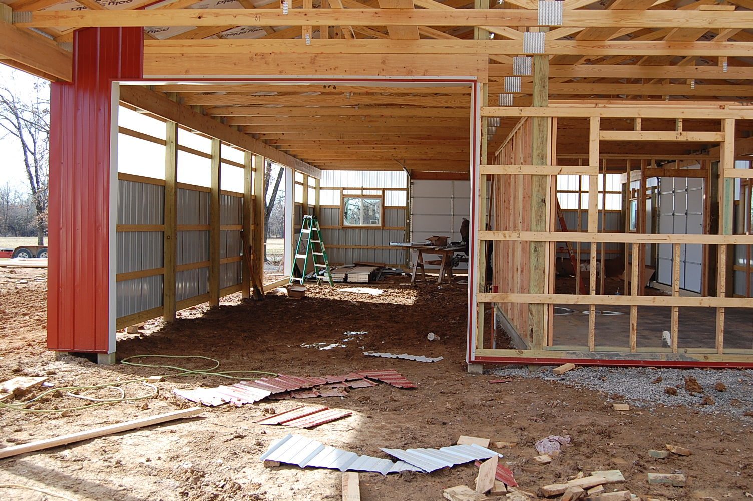 This picture was taken looking west. They are getting the other garage door ready to go on, that way the back of the barn will be enclosed. Still have one garage door to go on here on the east side. The east side of my work room, and above it will be in red. My room will be insulated, my sink will be directly behind the window opening you see here on the right. I am hoping the skylight material will allow enough light thru so I dont have to run the lights, but if I do, I would not think it would be any more that what it is now.