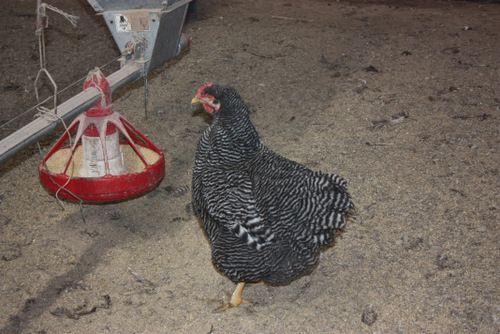 Here is looking from the barred rock pen to the Jersey Giants. You can see the feeder system a little better in this pic. We could hear the motor click on about every 5-10 minutes delivering feed down the entire length of the barn. I took this photo to try to see the head rooster for this pen. Unfortunately the automatic focus on this lens quit working a month ago and I haven't had a chance to replace it yet. However hopefully you can get an idea of what Hawkeye was talking about on the size of these birds - they are huge. I got a BR cockerel and pullet who are 16-17 weeks of age, and although they are not quite done growing yet, they are already the largest birds I currently have in my flock.