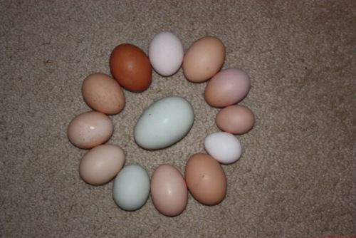 And now for something different. My EE hen, Suzette, has been renamed "Poor Suzette" after laying the biggest egg I've ever seen a couple of days ago. I've had double yolkers before, but this egg is in a class all its own. I know pictures of eggs rarely show their size as well as when you are holding it in your hand, but I did my best. I weighed this egg and it is 106g, or 3 3/4 oz. I haven't cracked it open yet as DD and DS both said they want to be there when I do. I've also considered hard-boiling it (for about 30 minutes LOL) - it would make a meal all on its own. To my amazement, not only did Poor Suzette not seem to suffer any ill effects after this, but by 9am the following morning she was back on the nest and laid a - thankfully normal sized - egg. I expected her to take a day or two or three off after this mammoth effort. I put the egg in a circle with some other eggs collected that same day. Note that the Marans egg is an extra large egg.